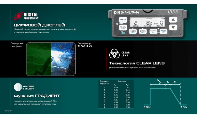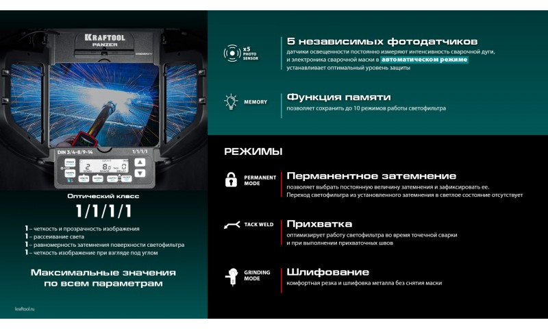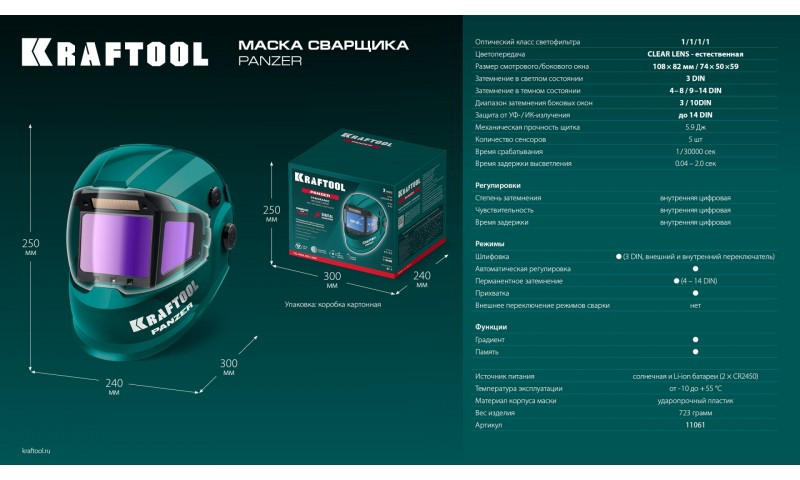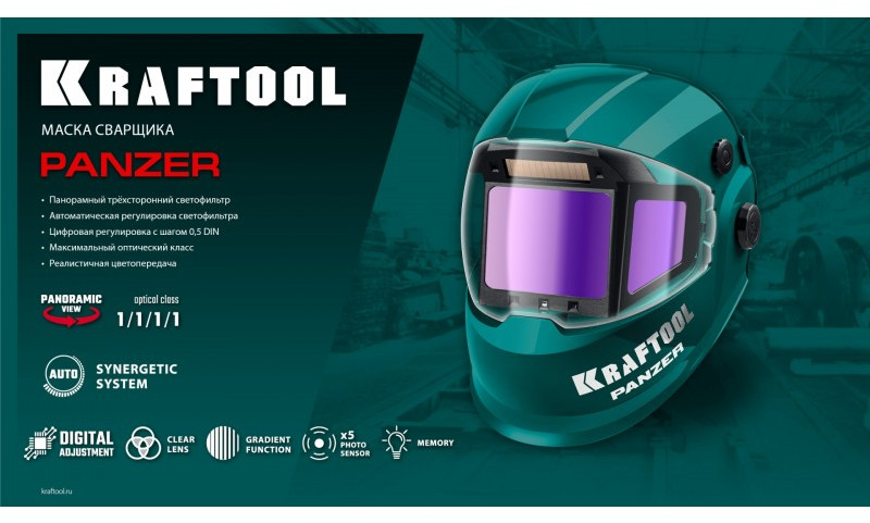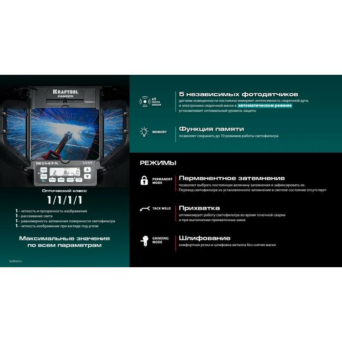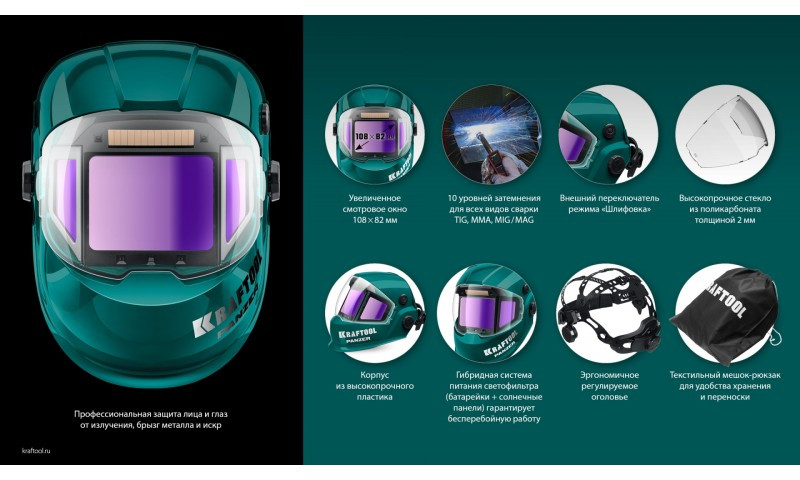 Профессиональная маска сварщика KRAFTOOL для защиты глаз и лица сварщика от прямых излучений сварочной дуги, искр и брызг расплавленного металла, от механических воздействий при выполнении сварочных работ, резки и пайки металла.