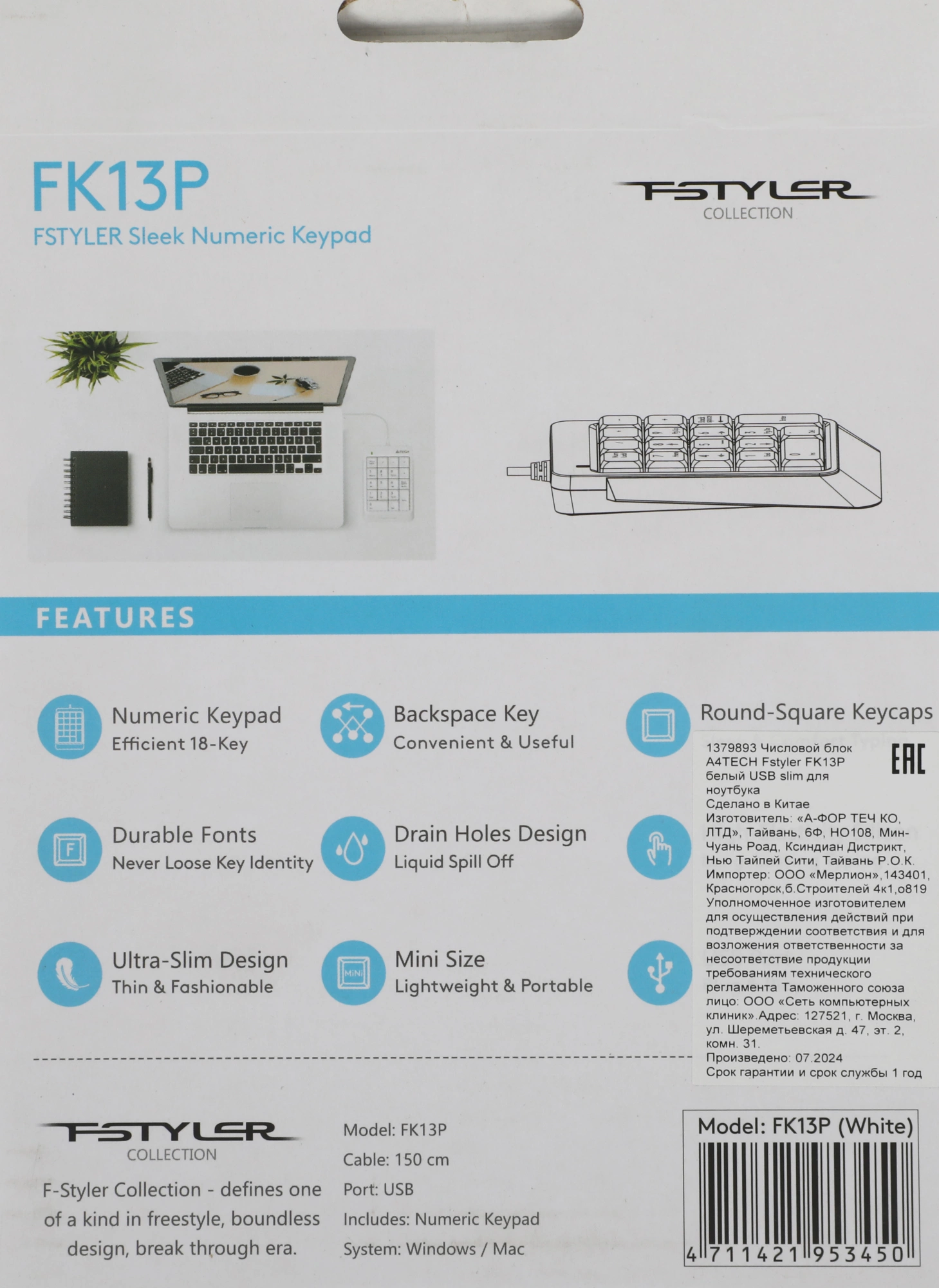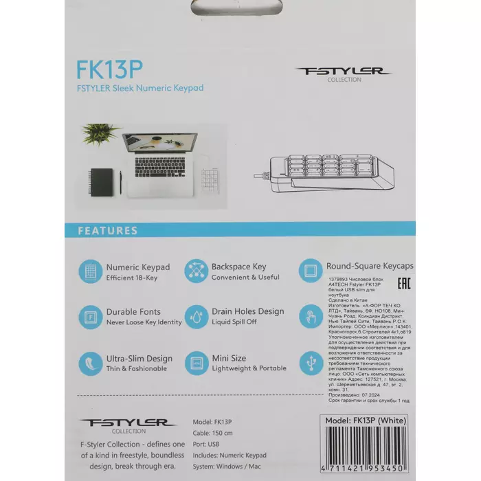 Числовой блок A4-Tech Fstyler FK13P WHITE белый USB slim для ноутбука