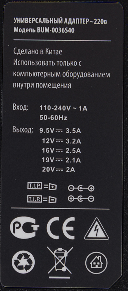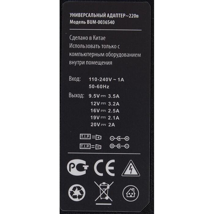 Универсальный сетевой адаптер для ноутбуков мощностью 40 ватт. В комплекте входят 8 сменных штекеров для основных марок ноутбуков. Выбор мощности для питания происходит в автоматическом режиме.