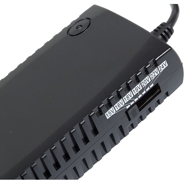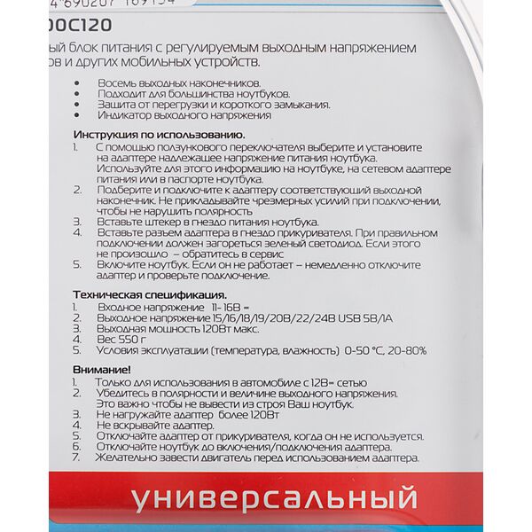 Универсальный автомобильный адаптер для ноутбуков мощностью 120 ватт и USB-портом для зарядки мобильных телефонов и планшетов. В комплекте входят 11 сменных штекеров, подходящих к большинству ноутбуков. Выбор мощности для питания происходит в ручном режиме.