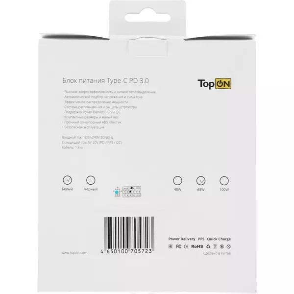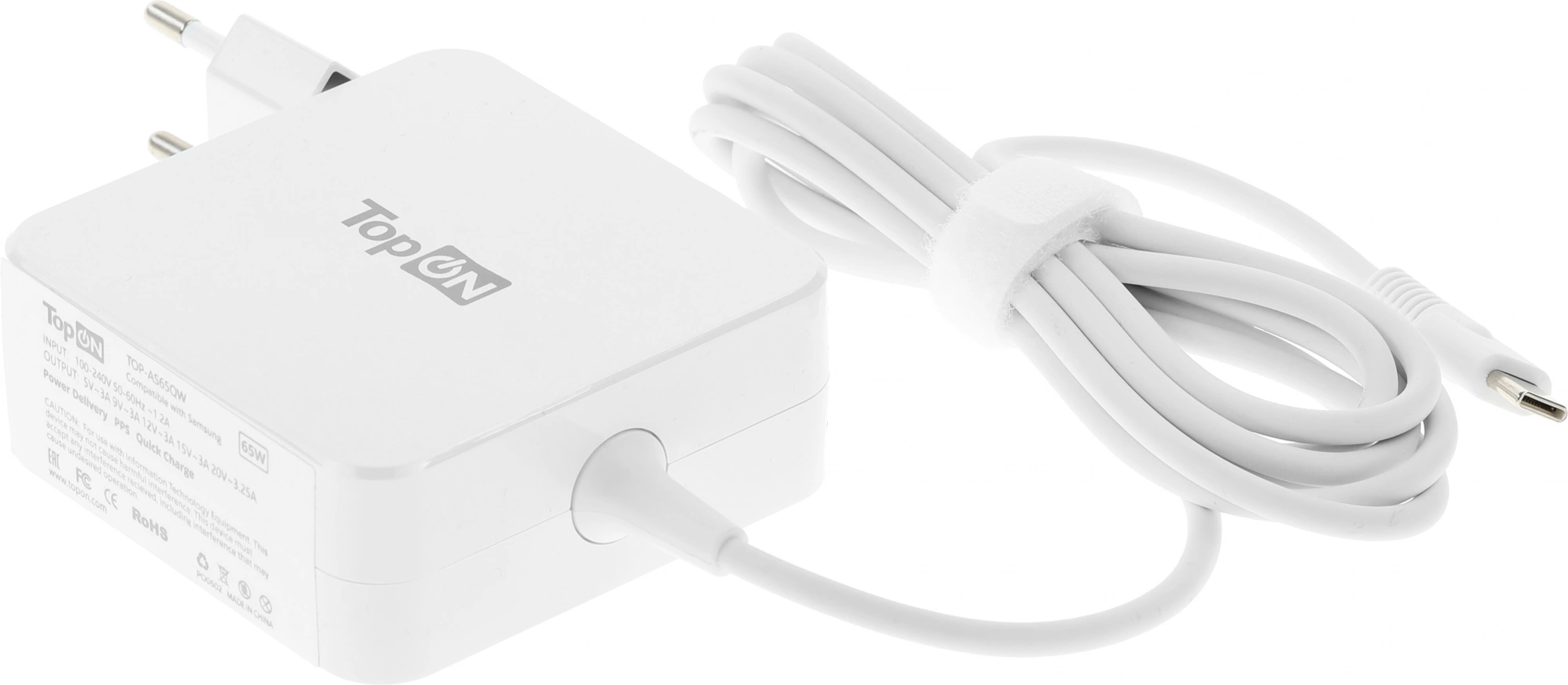 Блок питания TopON для ноутбука ASUS TOP-AS65QW 65W c кабелем Type-C, PowerDelivery 3.0. Подходит для зарядки ноутбуков Asus и других устройств через универсальный порт USB-C. Исходящий ток: 5V~3A, 9~3A, 12V~3A, 15V~3A, 20V~3.25A. Автоматический подбор напряжения и силы тока. Прочный ABS пластик.