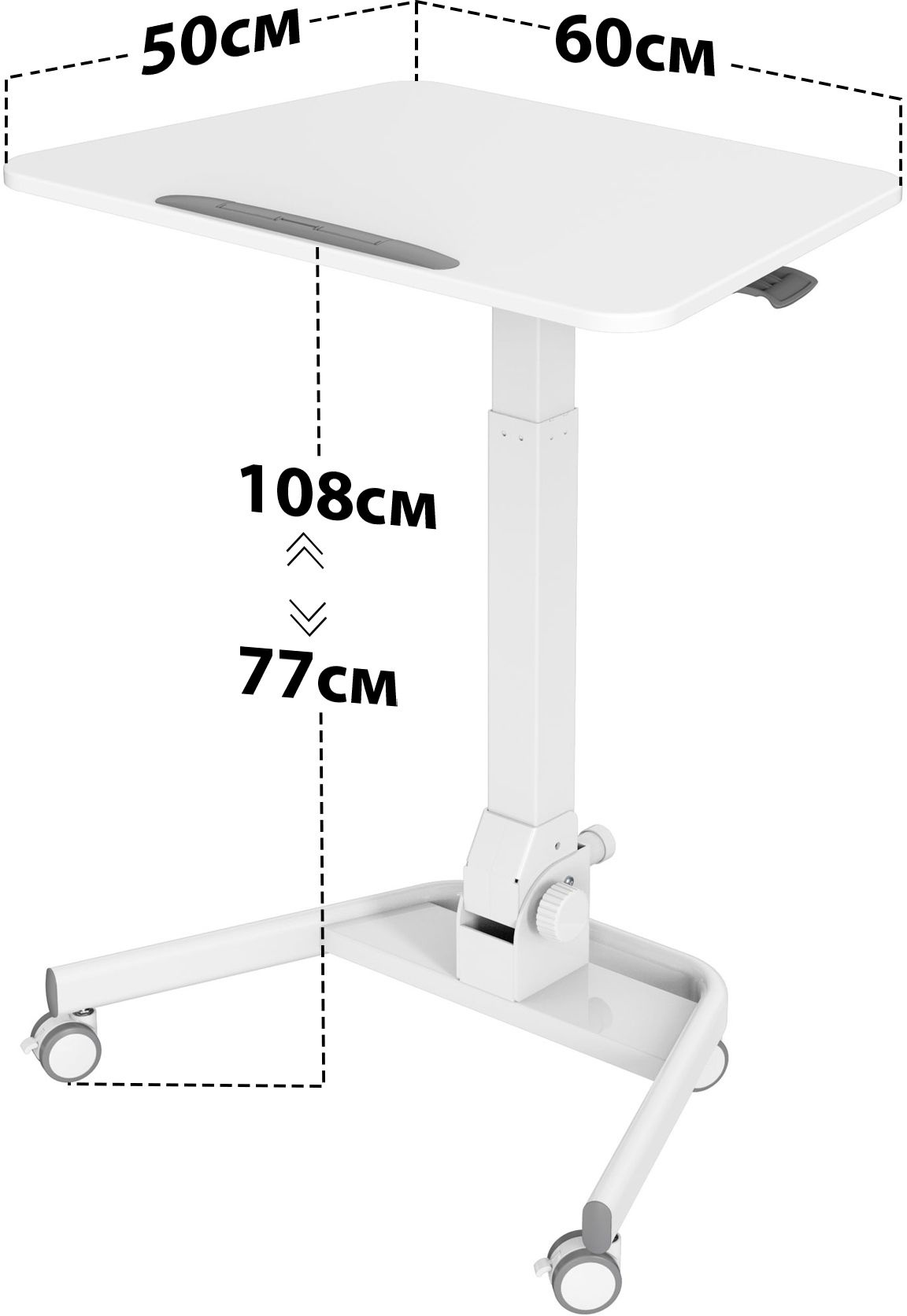 | Особенности | Простое управление: подъемный механизм плавно опускает и поднимает столешницу, можно остановить в любом положении. Наличие 4 колес обеспечивает маневренность, 2 колеса со стопором, для придания устойчивости. Полностью складной стол, удобное хранение и транспортировка. |