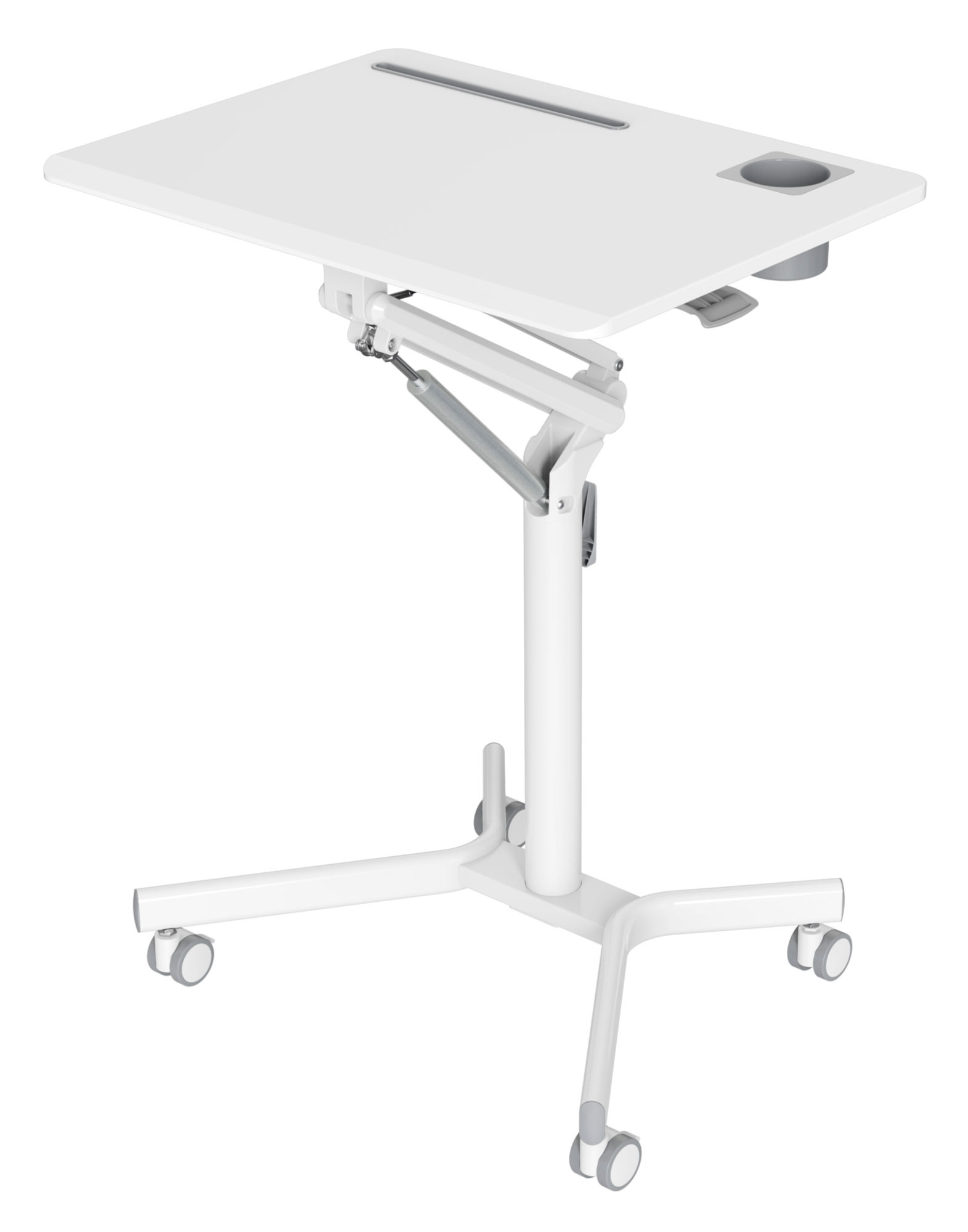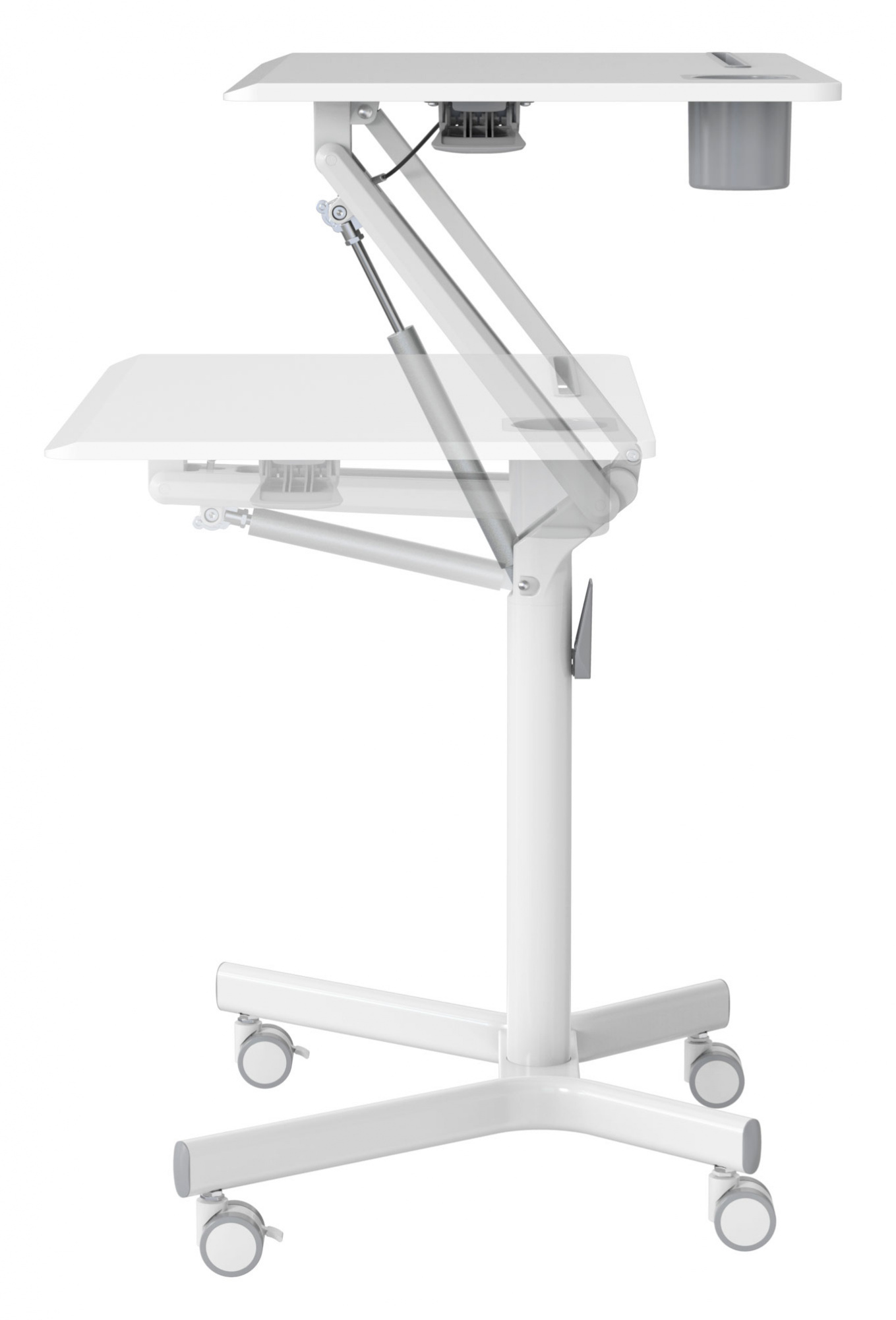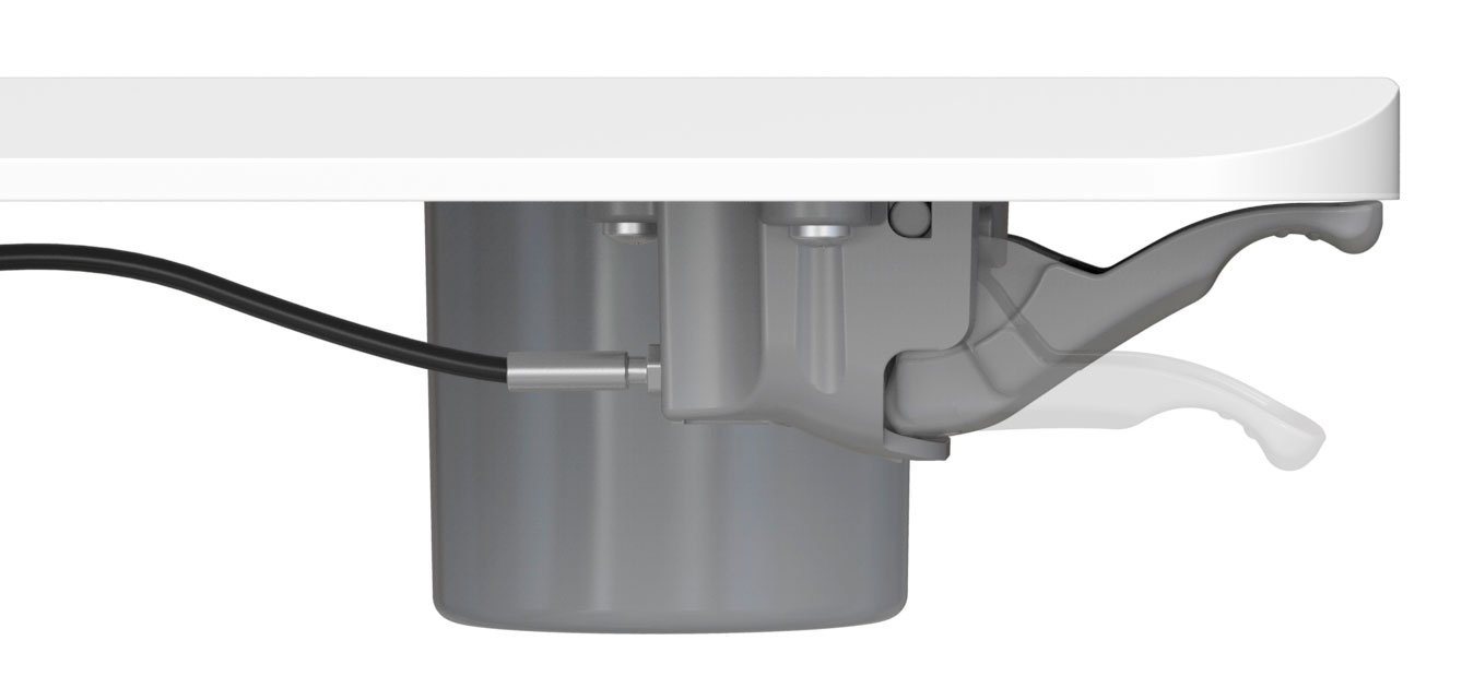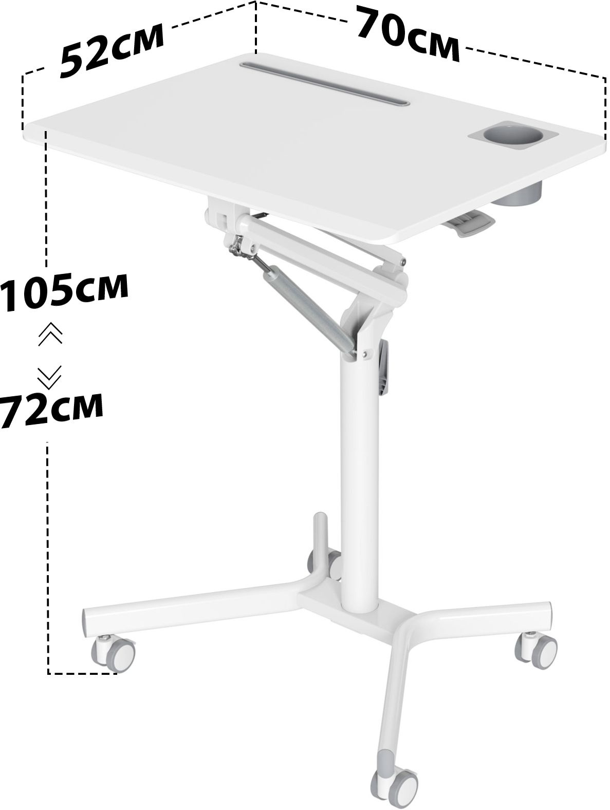 | Особенности | Подъемный механизм плавно опускает и поднимает столешницу, можно остановить в любом положении. Управление при помощи одного рычага. Наличие 4 колес обеспечивает маневренность, 2 колеса со стопором, для придания устойчивости. |