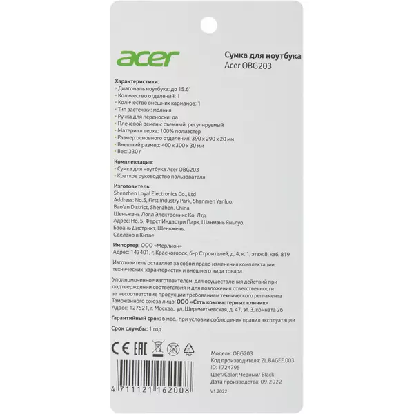 Наличие товара Acer LS series OBG203 [ZL.BAGEE.003]
