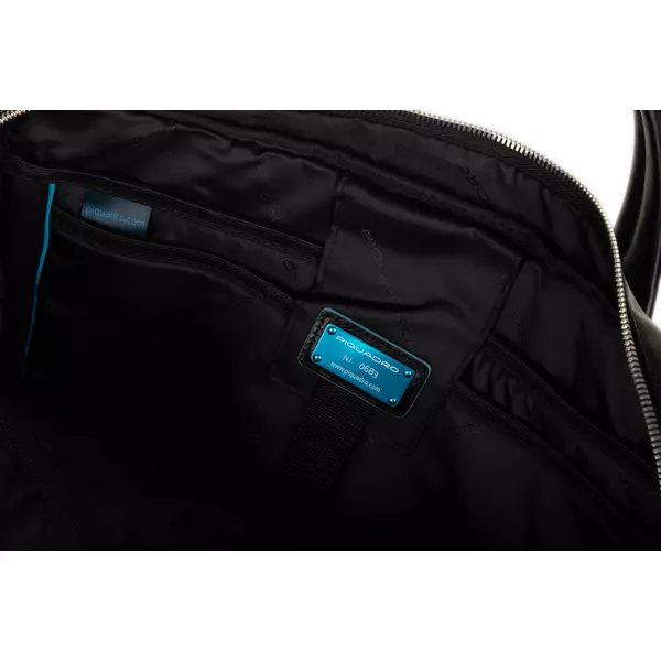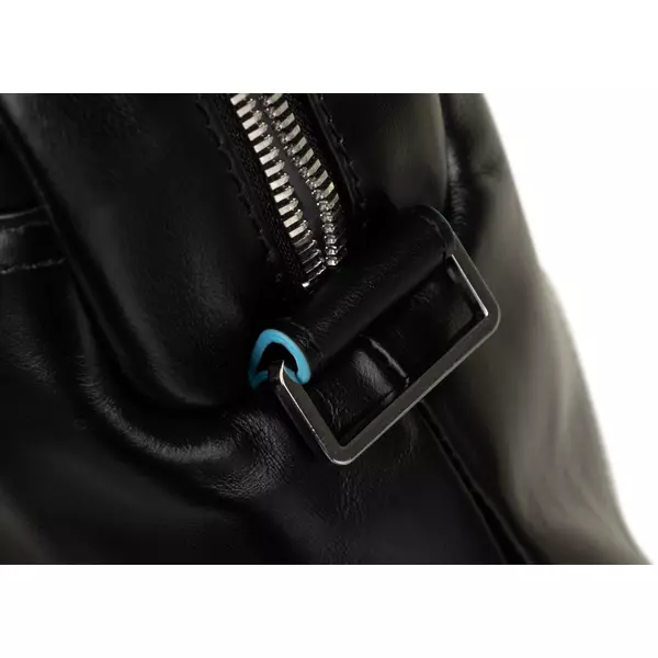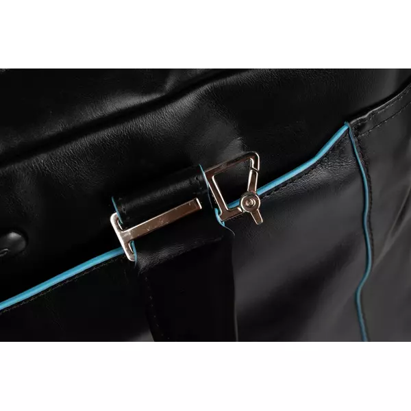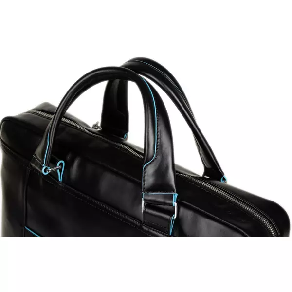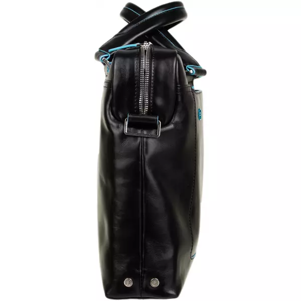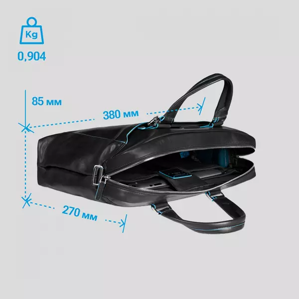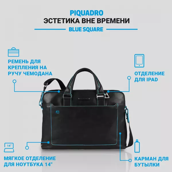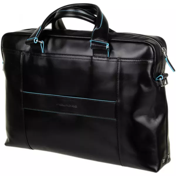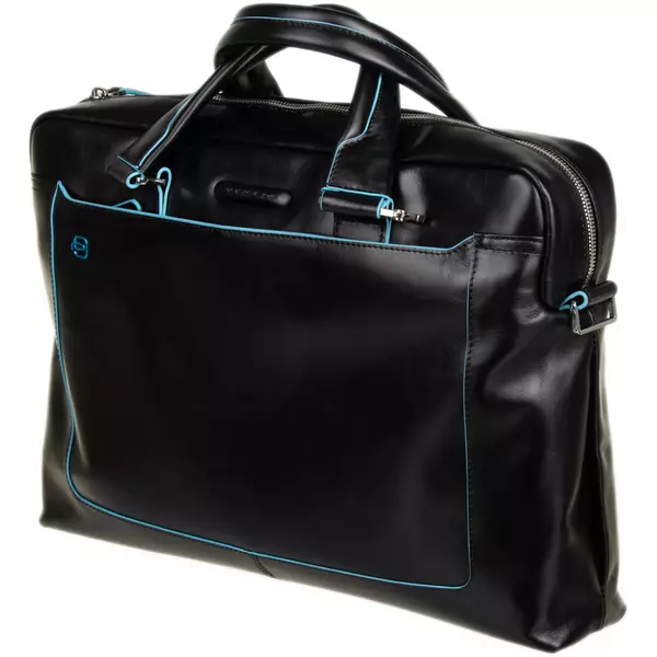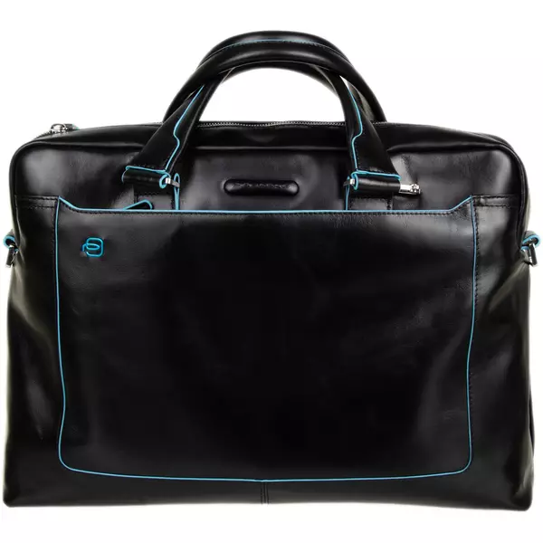 Сумка с двумя ручками из натуральной кожи с голубой окантовкой. Съемный плечевой ремень. Одно основное отделение, отделения для ноутбука (13") и iPad / iPad Air. Органайзер, карманы для мелких вещей и зонта. Система крепления к ручке багажной сумки. Внешний большой карман на молнии