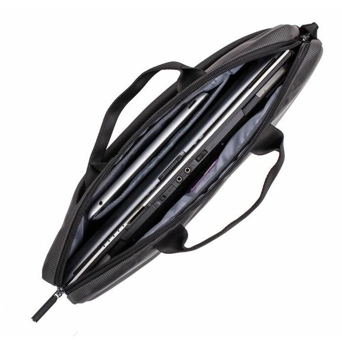 Подходит для ноутбуков до 15,6 дюймов. Она воплощает изысканность и профессионализм благодаря элегантным черным тканям и стильному диагональному дизайну. Ее универсальность, вместительность и защита позволят вам путешествовать организованно и подготовлено, куда бы вы ни направлялись.