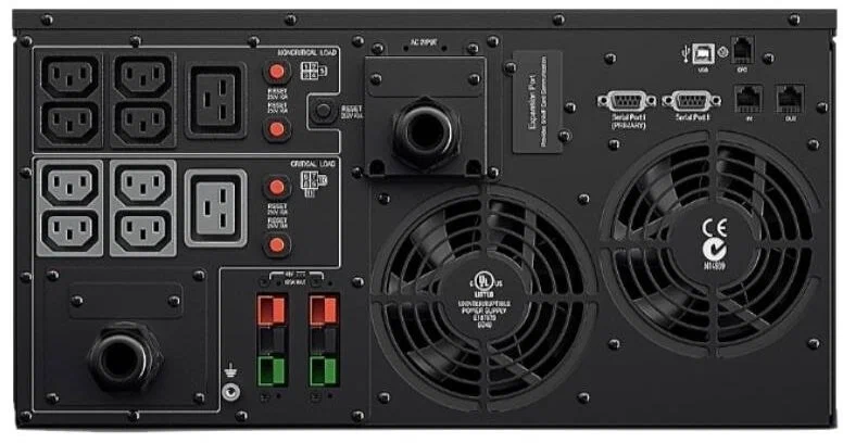 - Аварийное выключение питания/EPO - разъем аварийного отключения выходного напряжения (EPO) позволяет пользователю подключить ИБП к центральной системе аварийного отключения выходного напряжения и обеспечить дистанционное незамедлительное обесточивание подключенного оборудования без перевода в режим работы от батареи