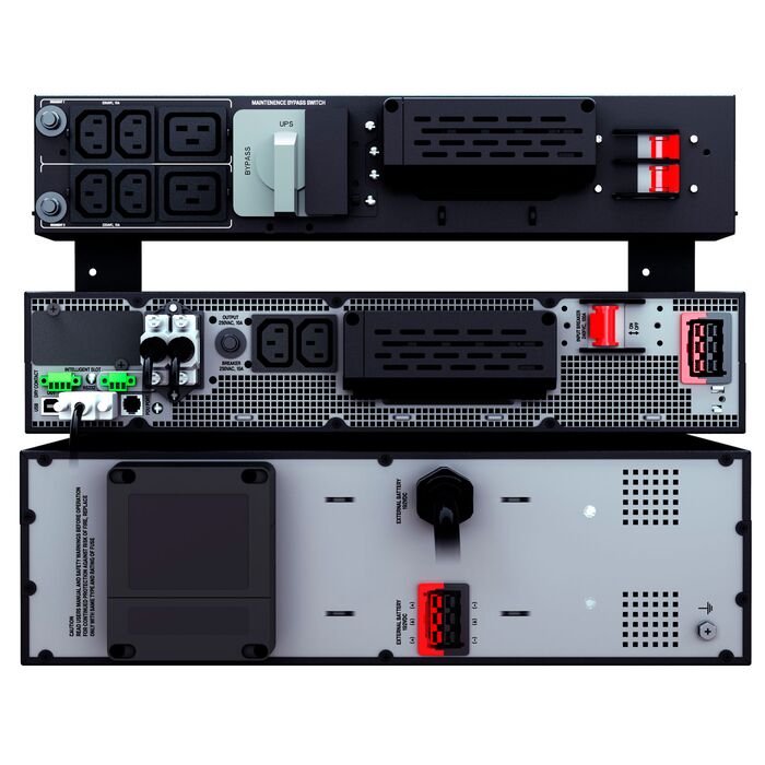 - Индикация состояния: Многофункциональный графический ЖКИ с кнопками управления и звуковым излучателем, а также индикаторами для быстрого определения состояния ИБП: норма - зеленый, режим работы от батареи – желтый, режим байпаса – желтый, сбой - красный