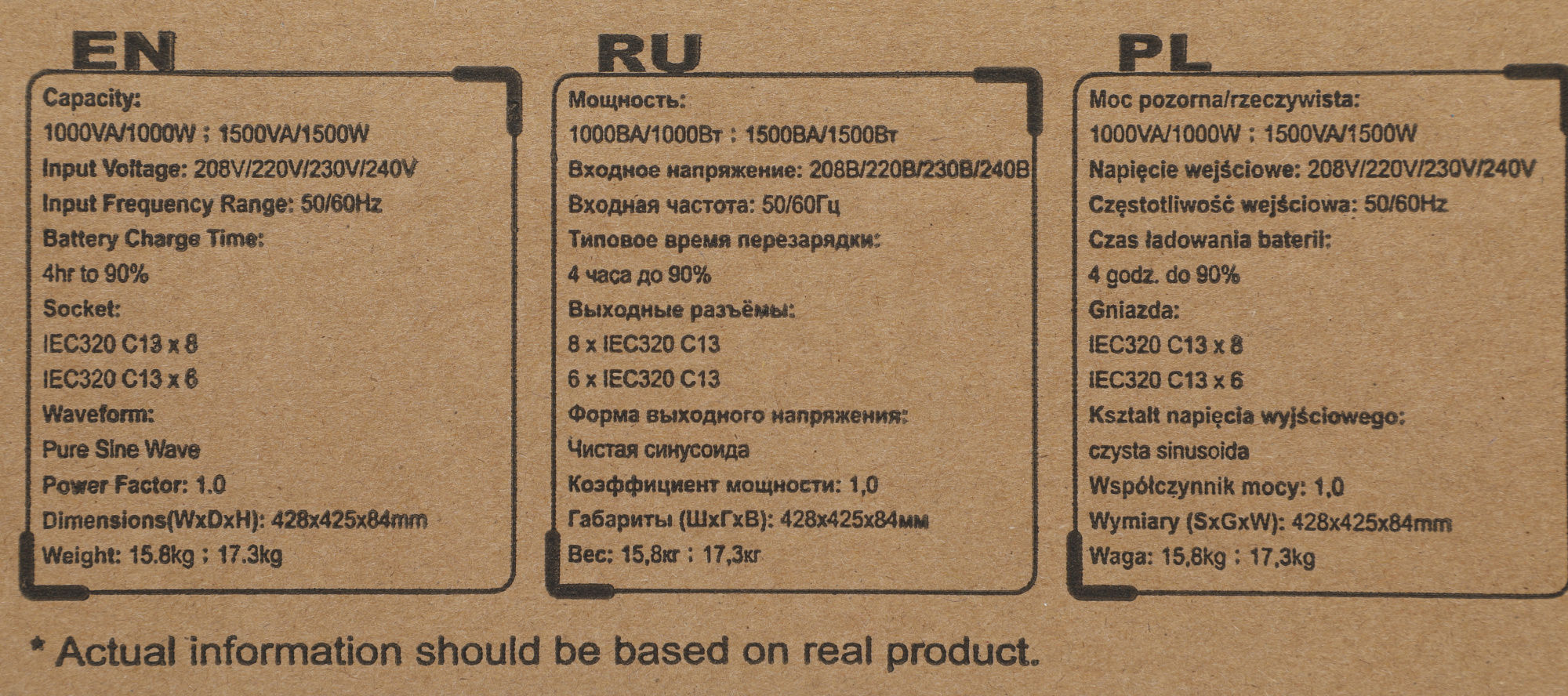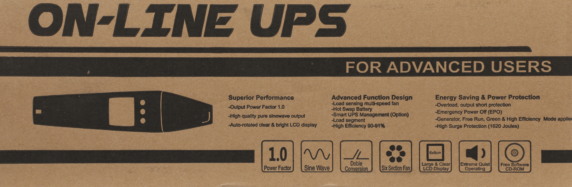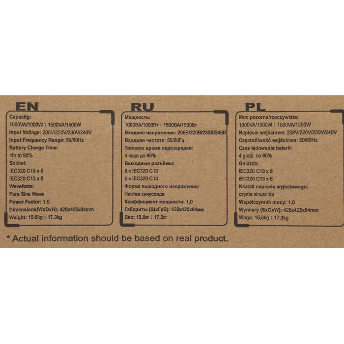 | Индикация состояния | Входное / выходное напряжение, частота входного / выходного напряжения; Режимы работы: нормальный, байпас, питание от батарей; уровень заряда батарей; уровень нагрузки; |