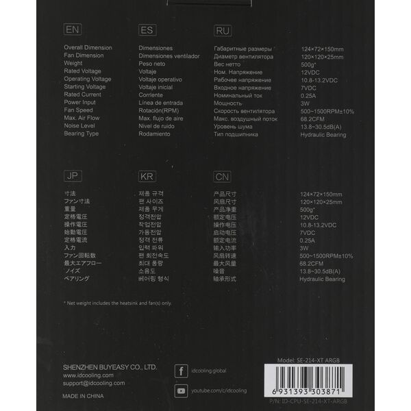 Устройство охлаждения(кулер) ID-Cooling SE-214-XT ARGB Soc-AM5/AM4/1200/1700/1851 черный 4-pin 16-29dB Al+Cu 180W 810gr RTL