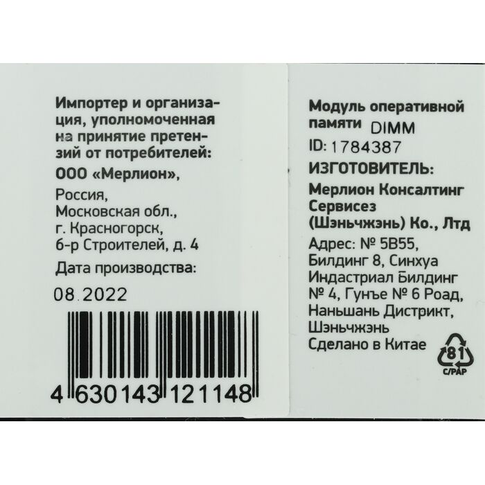 Характеристики Основные характеристики PartNumber / Артикул Производителя DGMAD43200008S Тип памяти DDR4 Количество в упаковке 1...