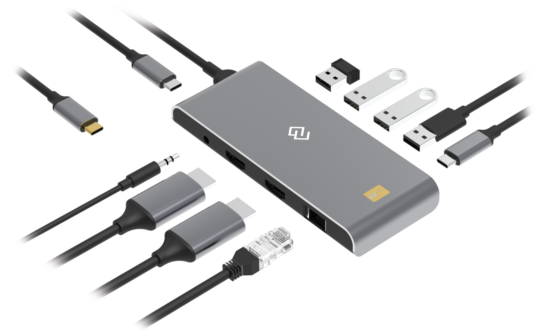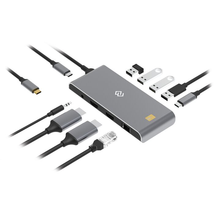 Type-C док-станция DIGMA, 8 портов - 2x HDMI (up to 4K@60Hz, 2K/FULL HD@144Hz), 2x USB-A 3.2 Gen1 (5Gbps), 2x USB-A 2.0 (480Mbps), 1x RJ45 (10/100/1000M), 1x 3.5mm Audio Jack, 1x USB-C 3.2 Gen1 (5Gbps), 1x USB-C PD (up to 100W)