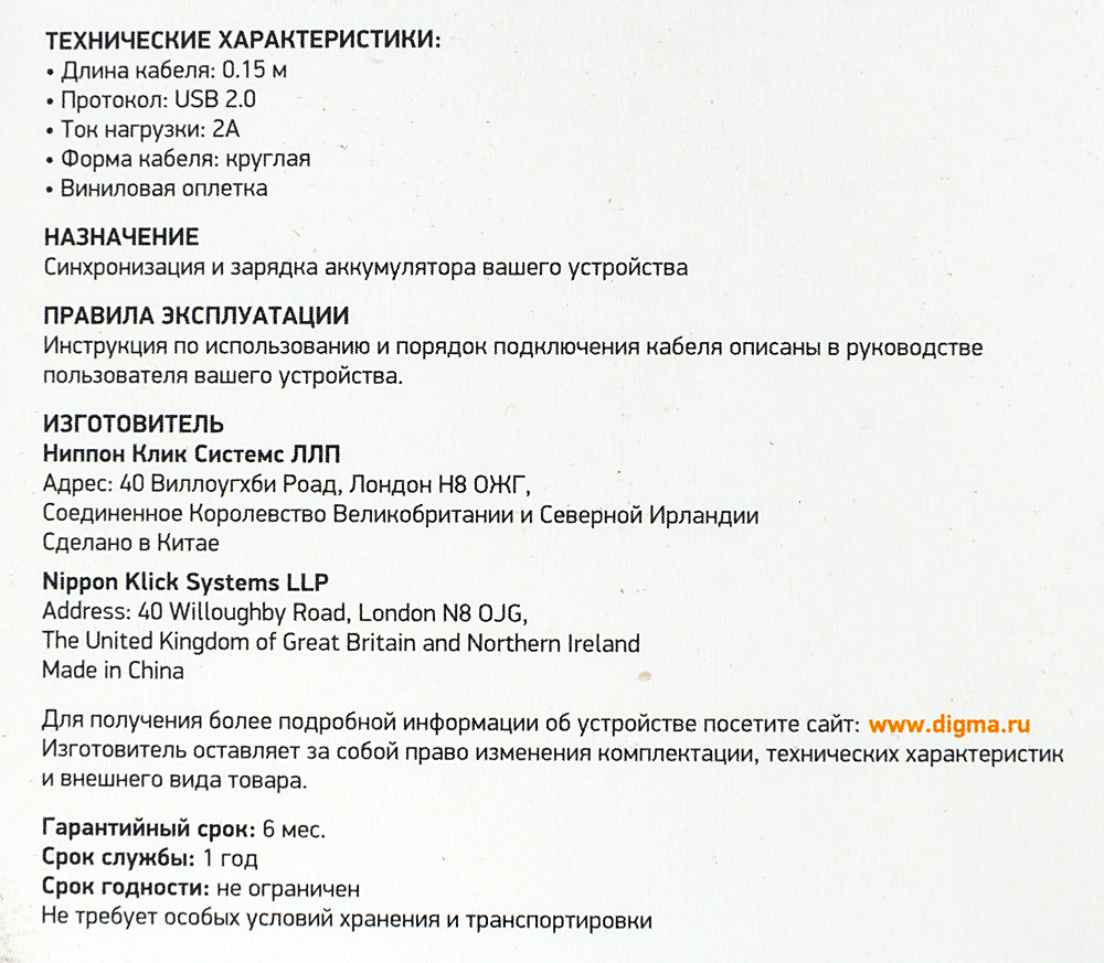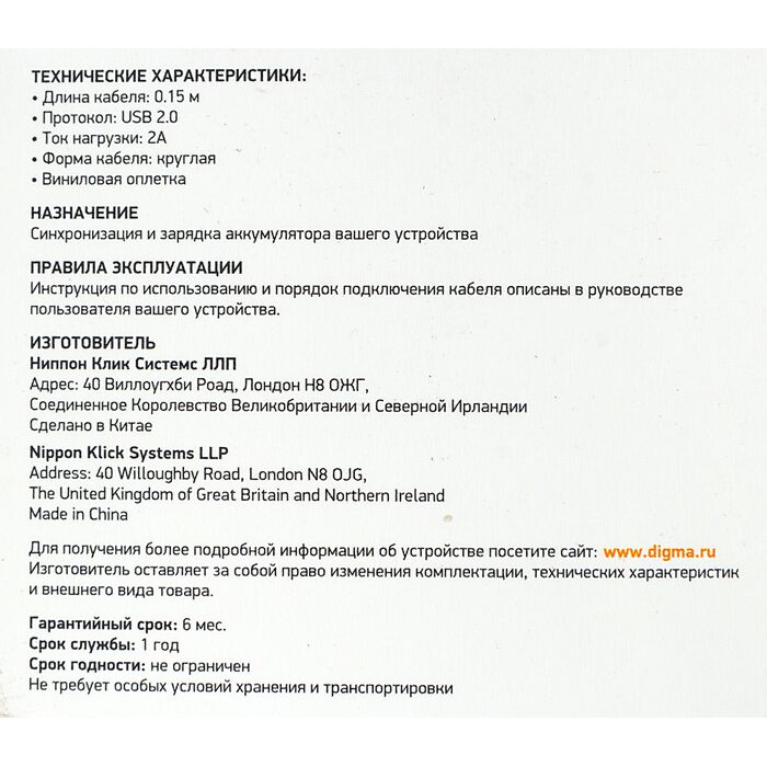 Кабель предназначен для передачи данных между мобильными устройствами и компьютером, а также для зарядки мобильного устройства от USB порта компьютера или сетевого зарядного устройства.