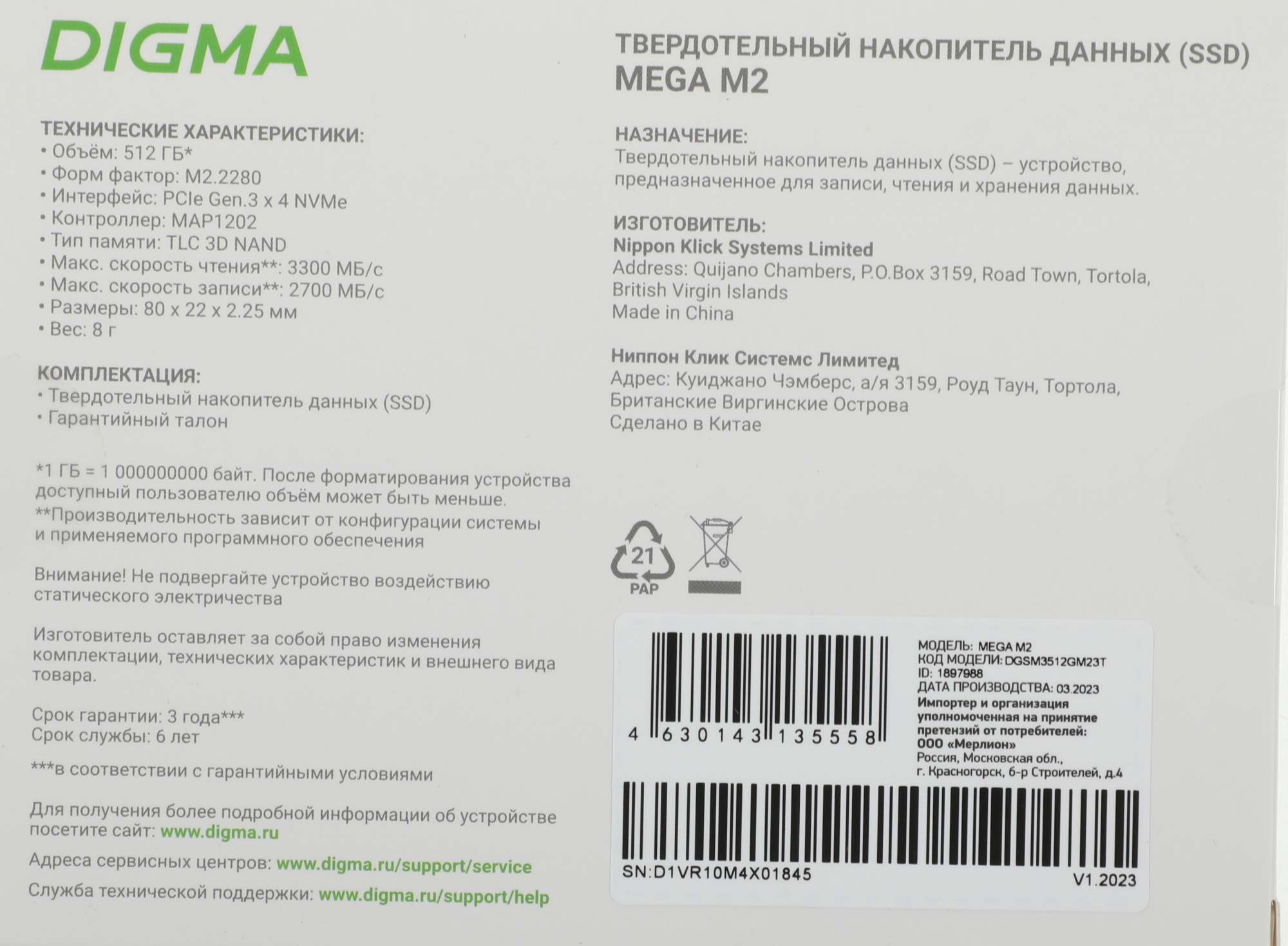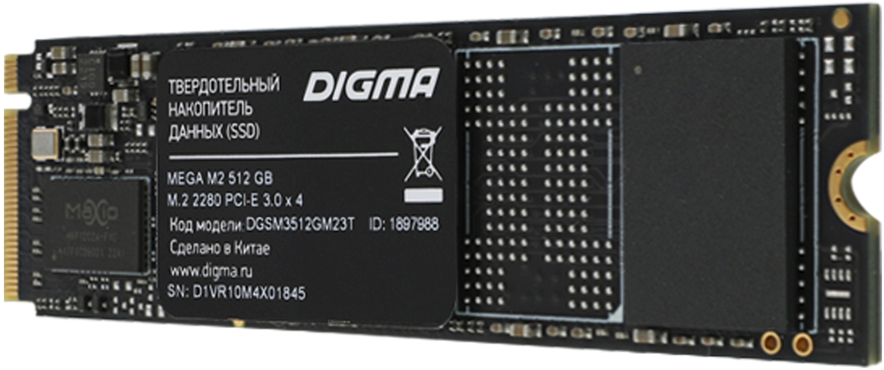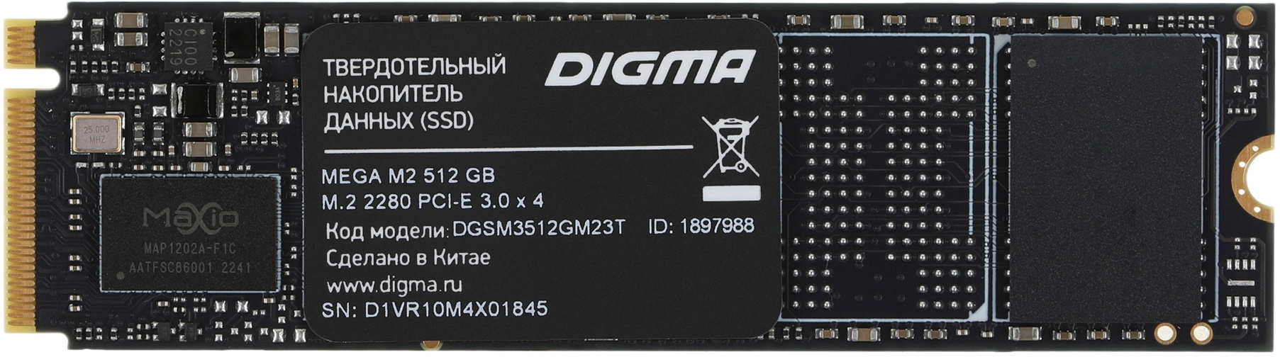 Объем SSD составляет 512 ГБ. Digma MEGA M2 предлагает невероятно высокий ресурс TBW – 375 ТБ. Устройство выполнено в компактном, широко распространенном форм-факторе M.2 2280. Толщина модели всего 2,25 мм. Твердотельный накопитель подойдет не только для ПК и игровых консолей, но и для очень тонких ноутбуков с поддержкой SSD PCIe 3.0 x4. Производитель отвечает за выдающиеся качество и надежность Digma MEGA M2: срок локальной гарантии на устройство – три года.