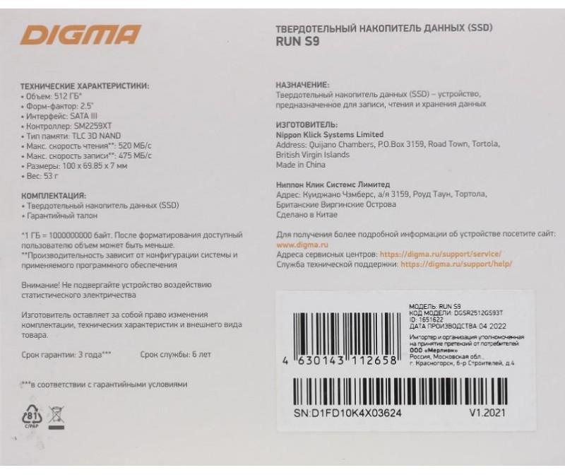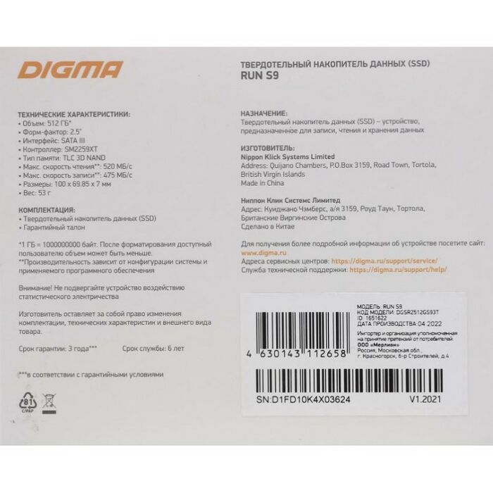 Описание Digma 512 Gb RUN S9