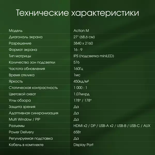 | Комплектация | кабель DP, инструкция пользователя, гарантийный талон |