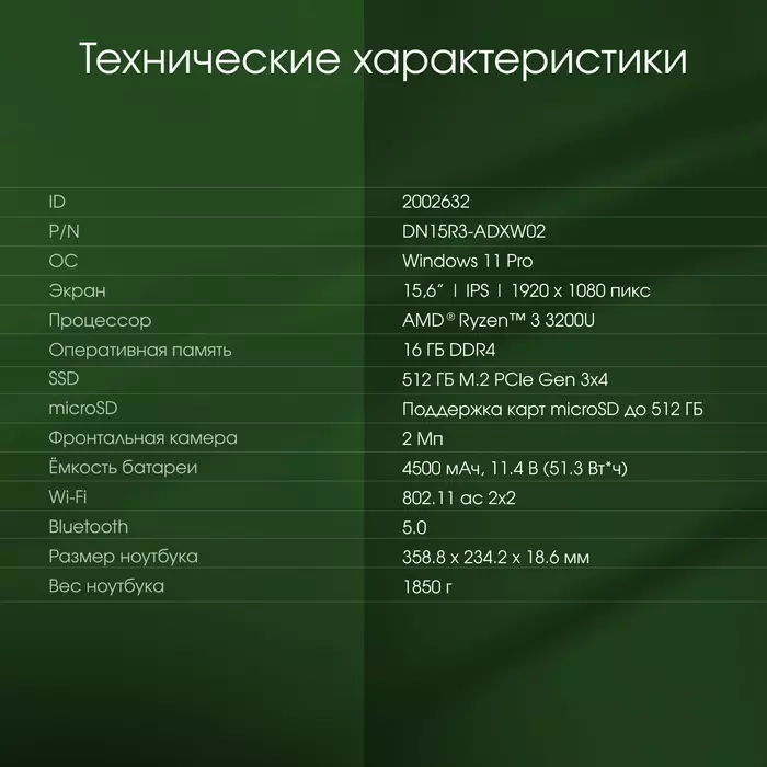 Ноутбук Digma Pro Parvus M Ryzen 3 3200U 16Gb SSD512Gb AMD Radeon 15.6" IPS FHD (1920x1080) Windows 11 Professional dk.grey WiFi BT Cam 4500mAh [DN15R3-ADXW02]