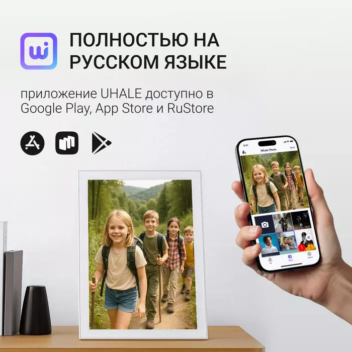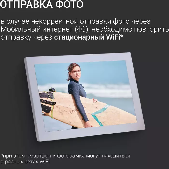 | Особенности | WiFi фоторамка, работа через приложение на iOS и Android. Удаленное управление и обмен и фотографиями и видео. |