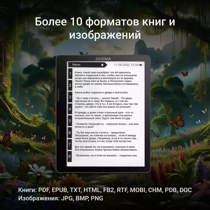 Подержка форматов книг AZW3, MOBI, DJVU, DOC, DOCX, EPUB, FB2, FB2.ZIP, PDF, PRC, TXT, CHM