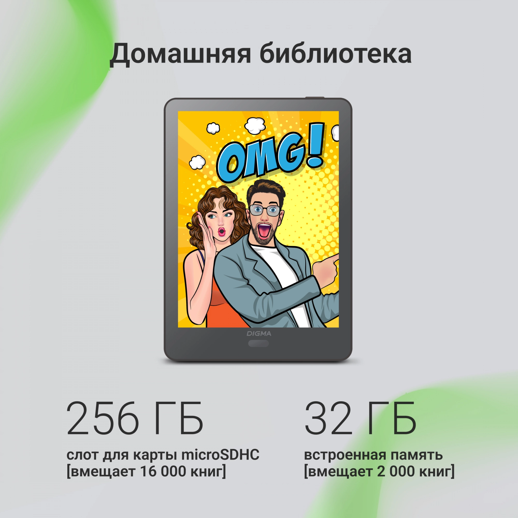 Электронная книга Digma P6B с 6-дюймовым экраном E-Ink Kaleido 3, оснащенная сенсорным дисплеем с разрешением 1072x1448, процессором с частотой 1.8 ГГц, а также памятью 3/32 ГБ. Устройство поддерживает карты SD/microSDHC. Цвет корпуса — темно-серый.