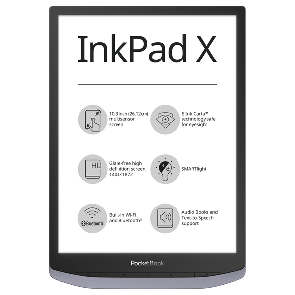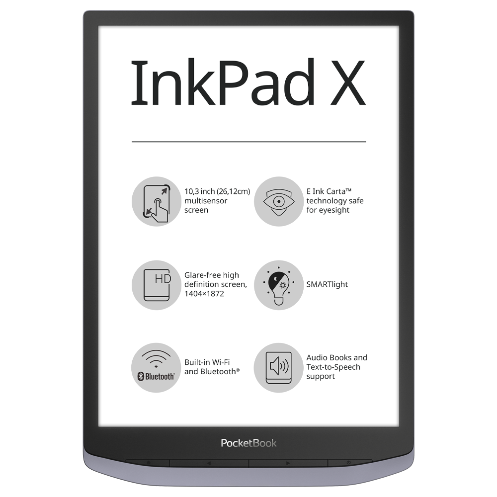 PocketBook InkPad X – черно-белый ридер для тех, кому мало и 6 дюймов, и 7,8. У PocketBook InkPad X – целых 10,3 дюйма: экран огромный, максимально похожий на качественную бумагу, с высоким разрешением – и оттого идеально подходящий для литературы нестандартного формата