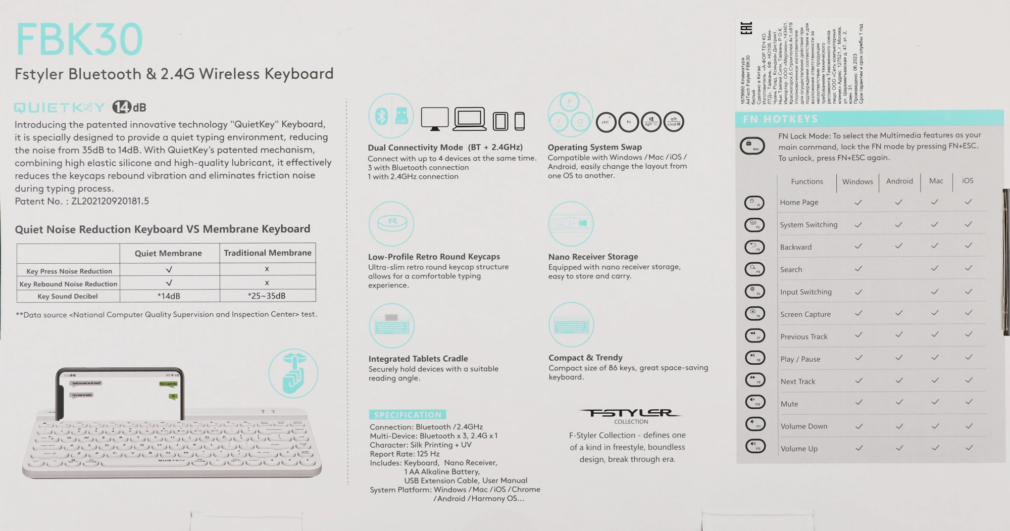 | Особенности | Клавиатура поддерживает два режима подключения - по беспроводной технологии Bluetooth и с помощью USB-ресивера 2,4 ГГц, и работает на удалении до 10 м, обеспечивая быструю передачу данных без задержек. |