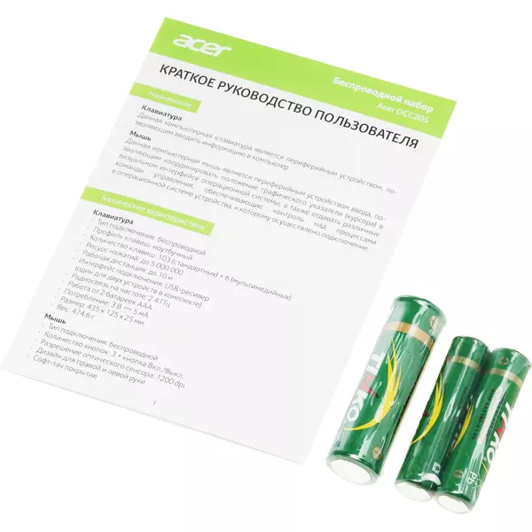 | Комплект поставки | Беспроводные клавиатура и мышь USB-ресивер (единый для двух устройств)Батарейки АА х 1 штБатарейка ААА х 2 штКраткое руководство пользователя |