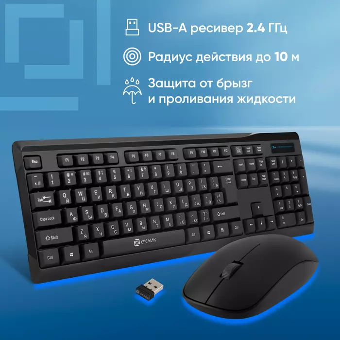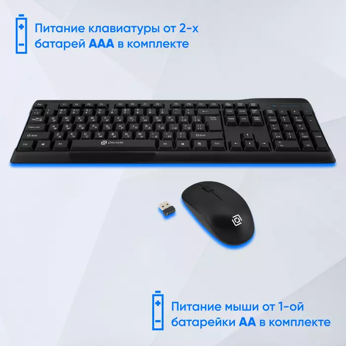 | Особенности комплекта | Клавиатура и мышь подключаются к ПК при помощи одного компактного USB-ресивера |