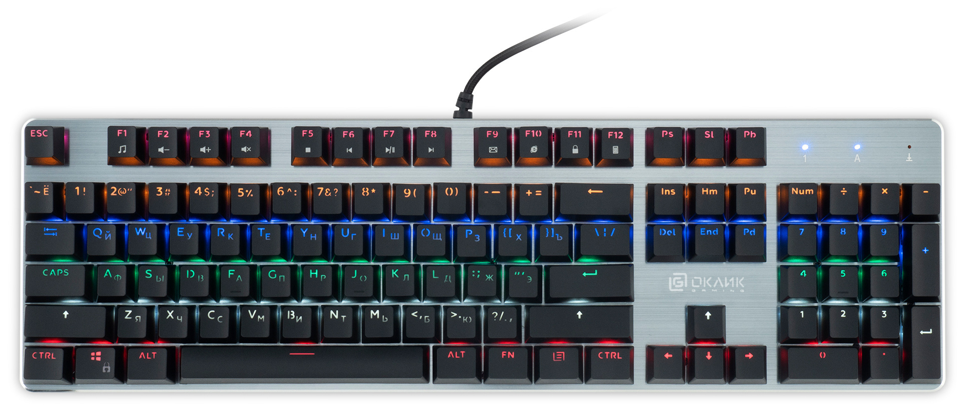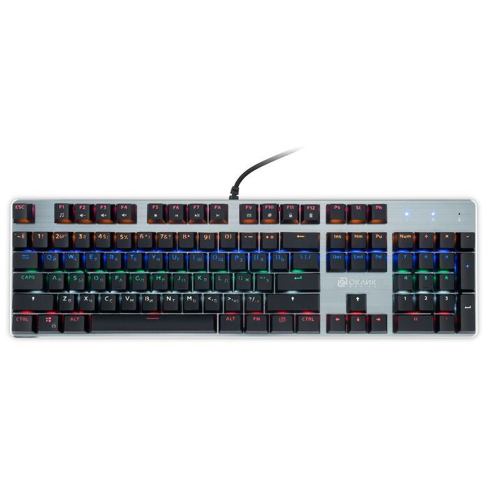 | Особенности | Ресурс до 50 000 000 нажатий, Anti-Ghosting на все клавиши, мультимедийные клавиши (FN+F1-F12), многоцветная подсветка с 10 режимами, игровые переключатели Outemu Blue, металлический корпус и кабель в прочной оплетке с позолоченным коннектором и ферритовым фильтром, регулировка клавиатуры по высоте. |