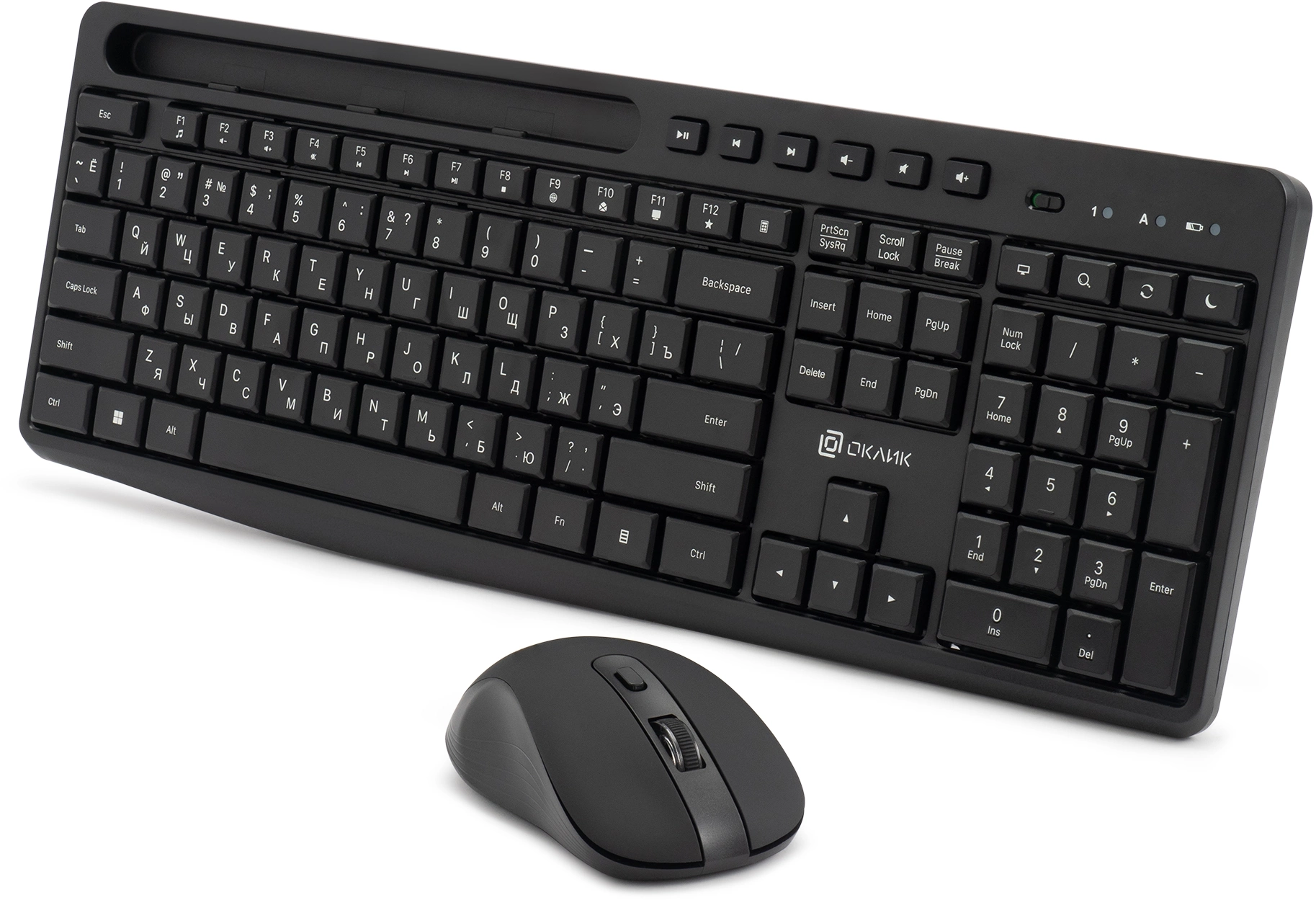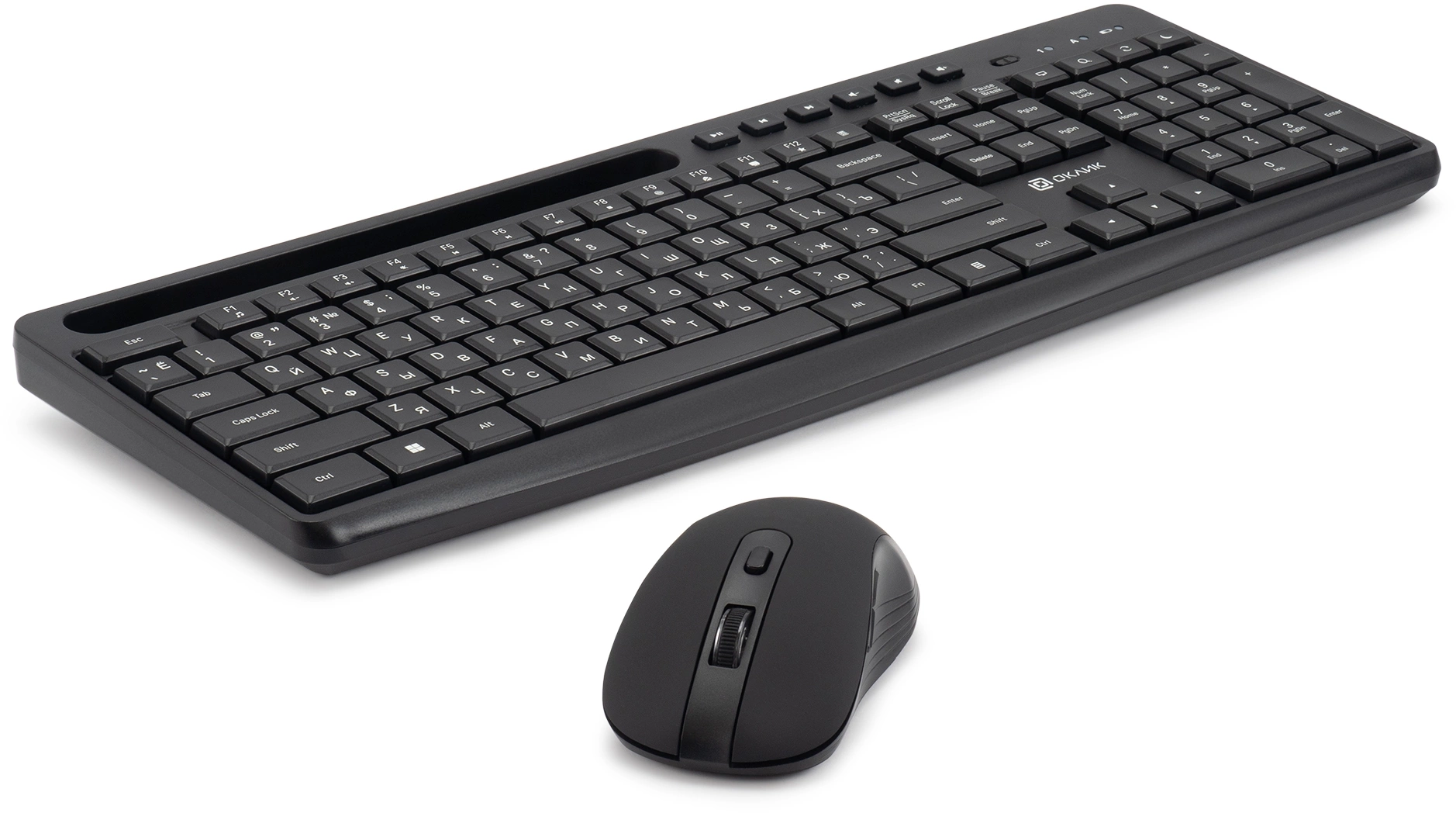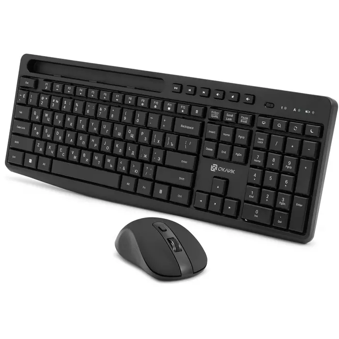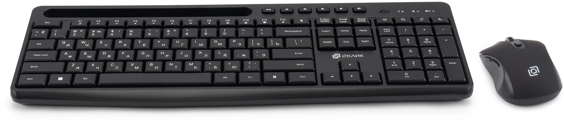 | Особенности комплекта | Бесшумный офисный комплект с дополнительными клавишами клавиатуры и беспроводным подключением. Размер холдера для размещения мобильных устройств: 21,5 см x 1,5 см. |