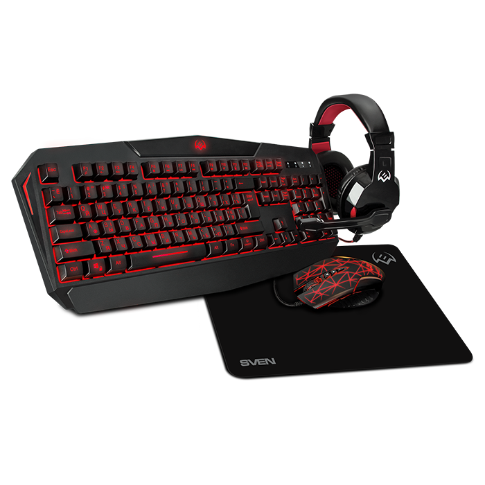 Игровой комплект периферийных устройств SVEN GS-4300 представляет собой оптимальное решение для пользователей, заинтересованных в качественном оборудовании для компьютерных игр. В состав набора входят клавиатура, гарнитура, мышь и коврик, разработанные с учетом требований современных геймеров.