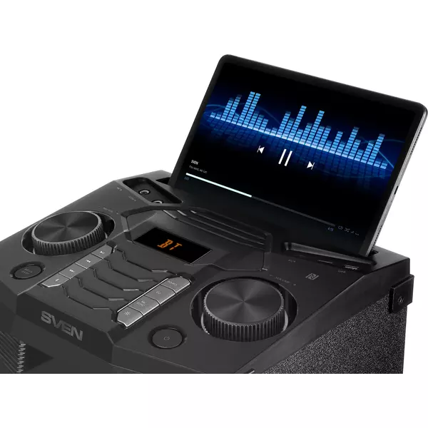 | Особенности | Отдельный вход для гитары или другого музыкального инструмента позволяет не только петь караоке, но и аккомпанировать себе самостоятельно. На верхней панели размещена подставка для смартфона. |