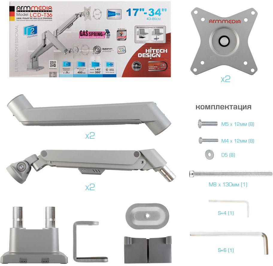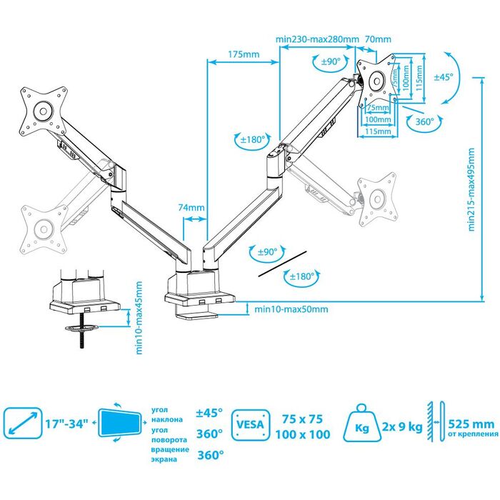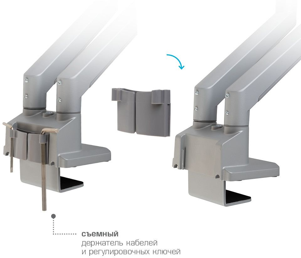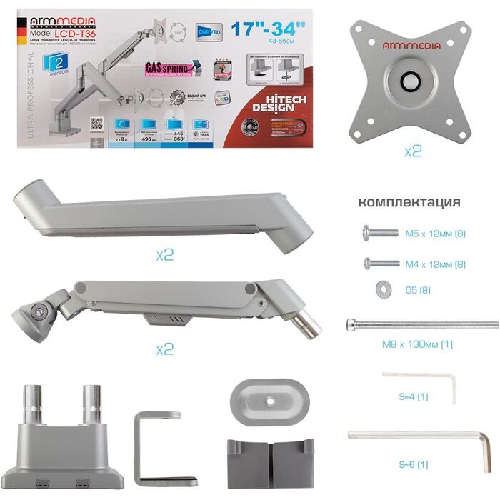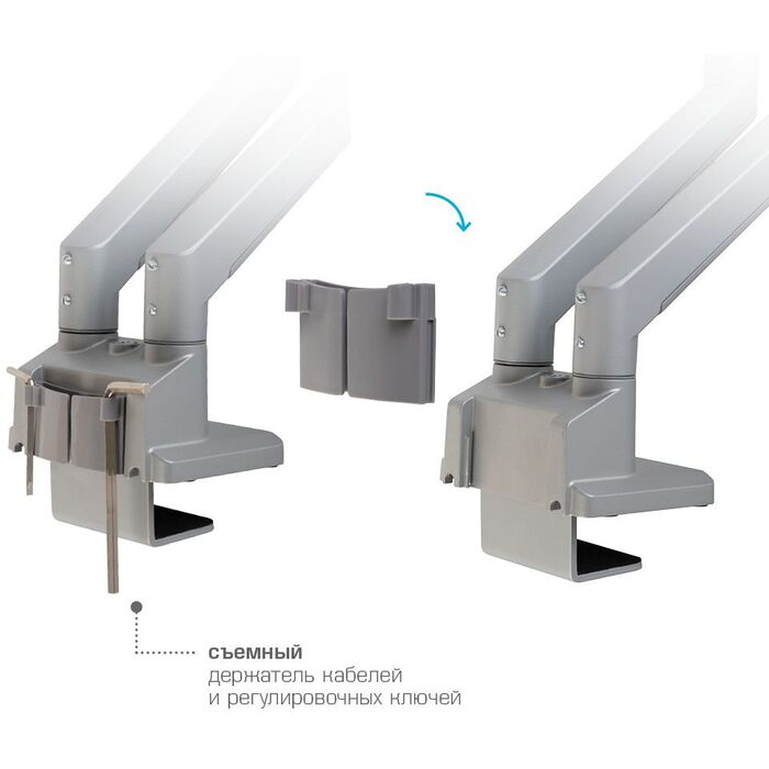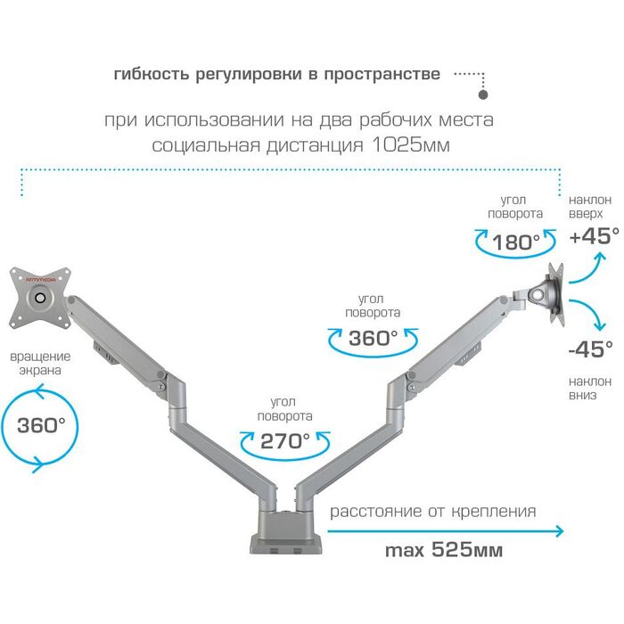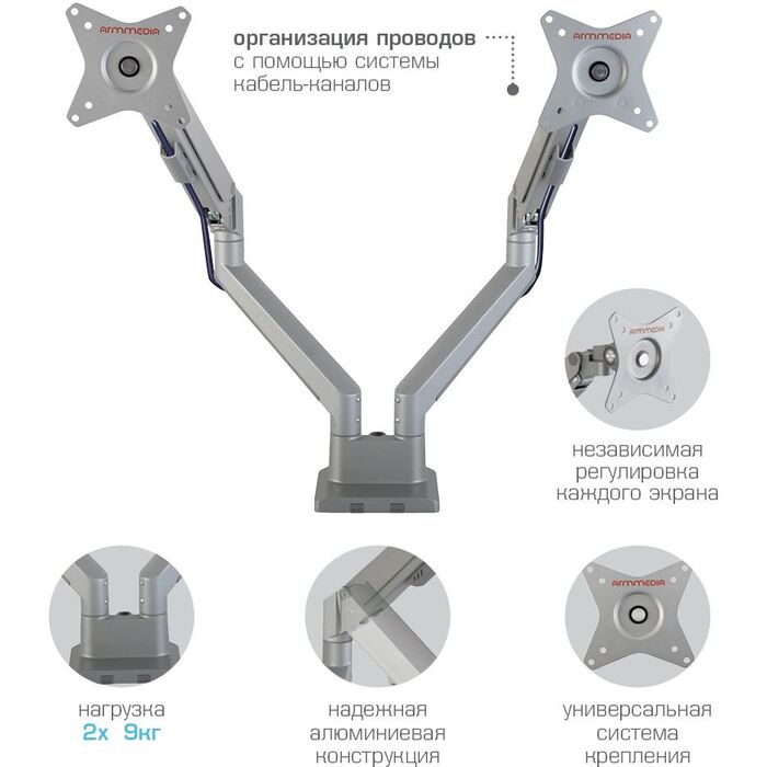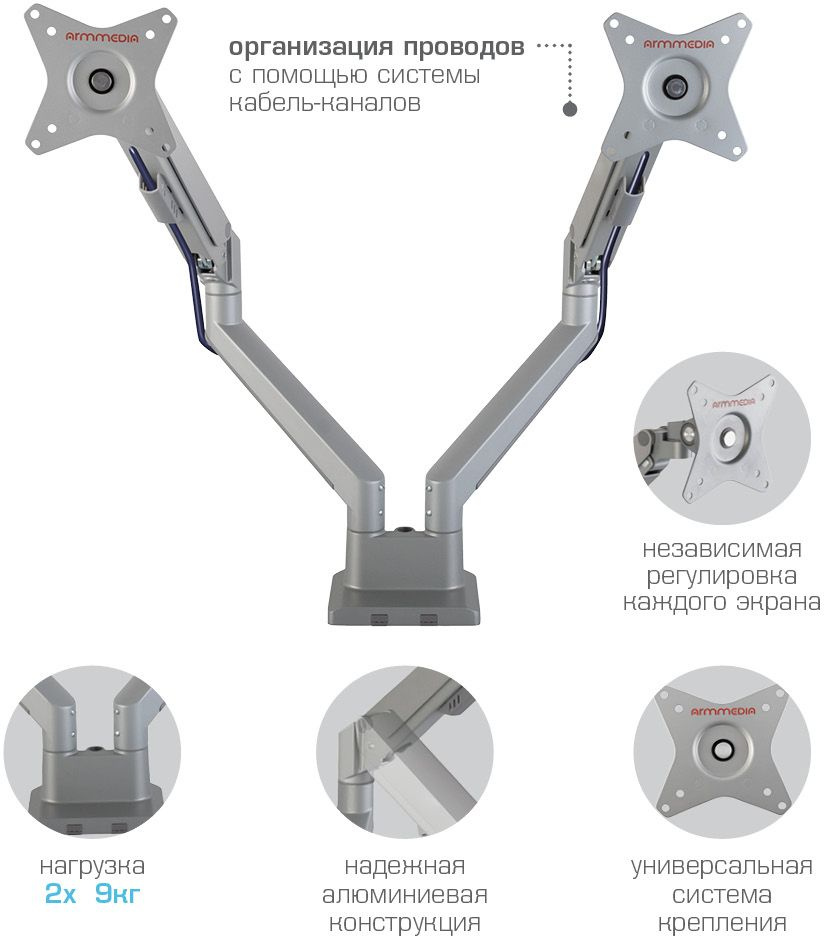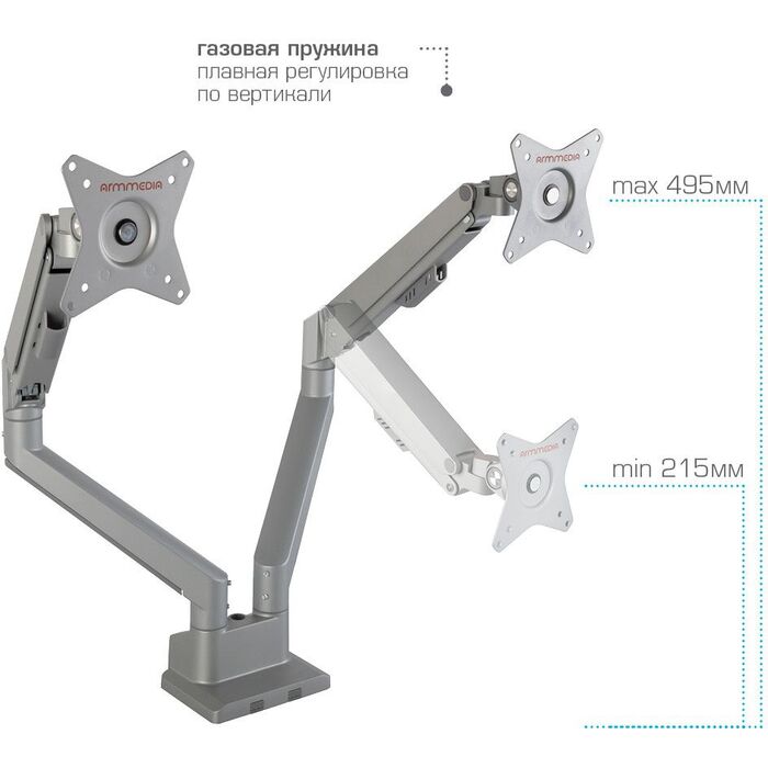 | Особенности | Независимая регулировка каждого экрана - мониторы можно поворачивать вокруг своей оси на 360°, наклонять вверх и вниз, придвигать или удалять, Встроенная газовая пружина обеспечивает движение экрана вверх и вниз, фиксацию в любом промежуточном положении |