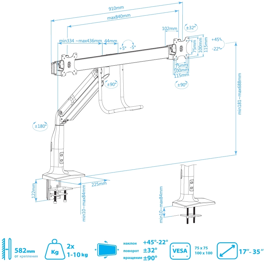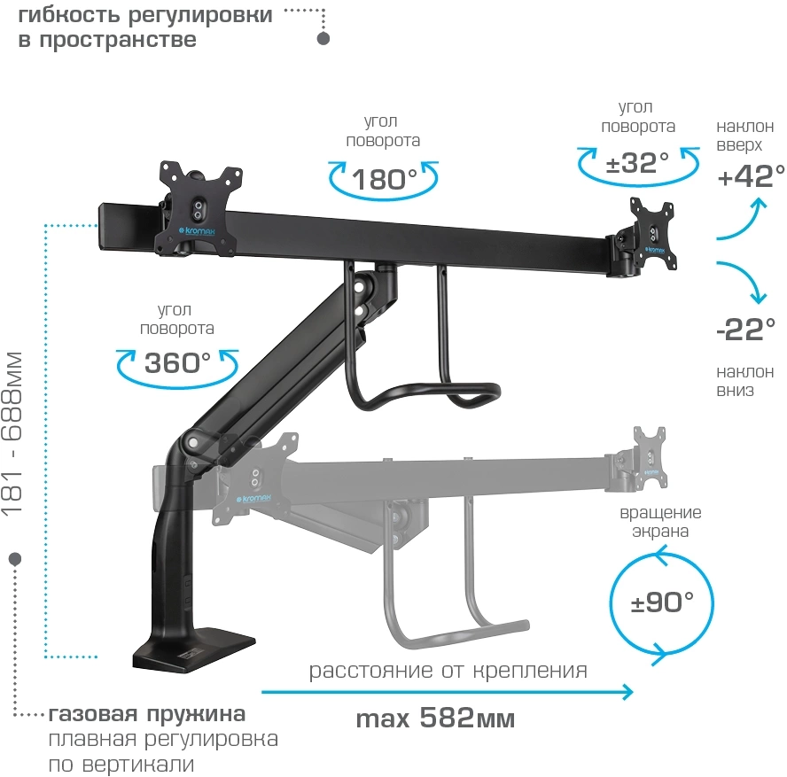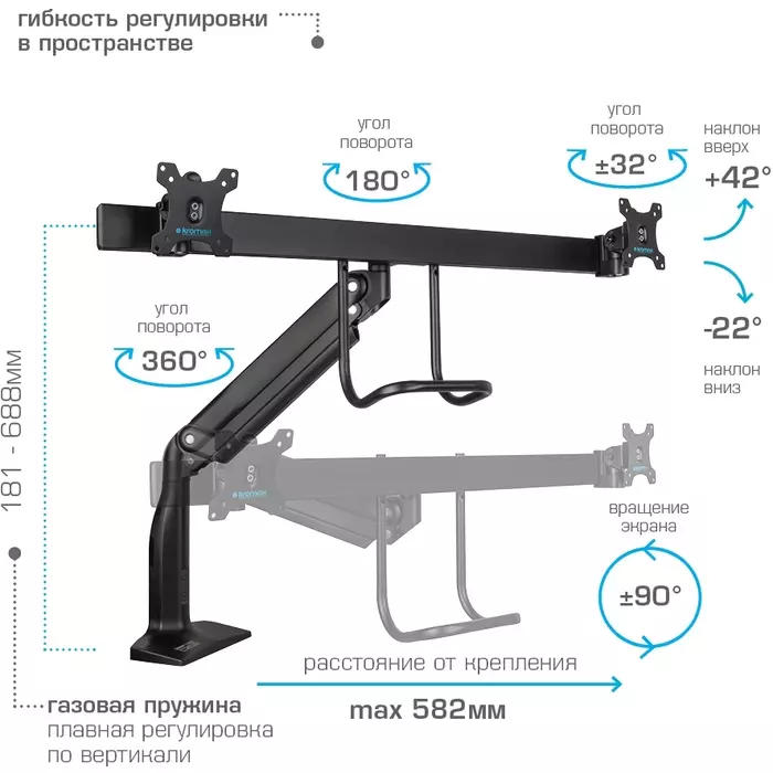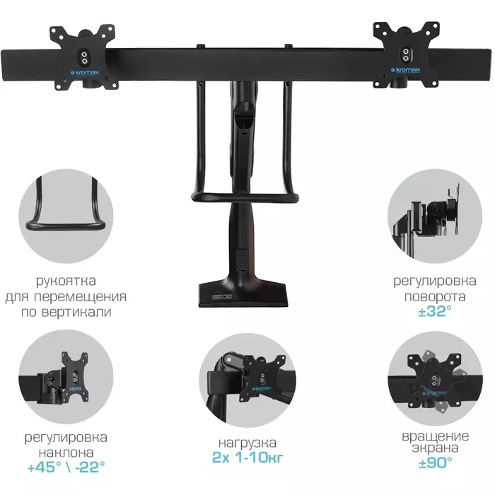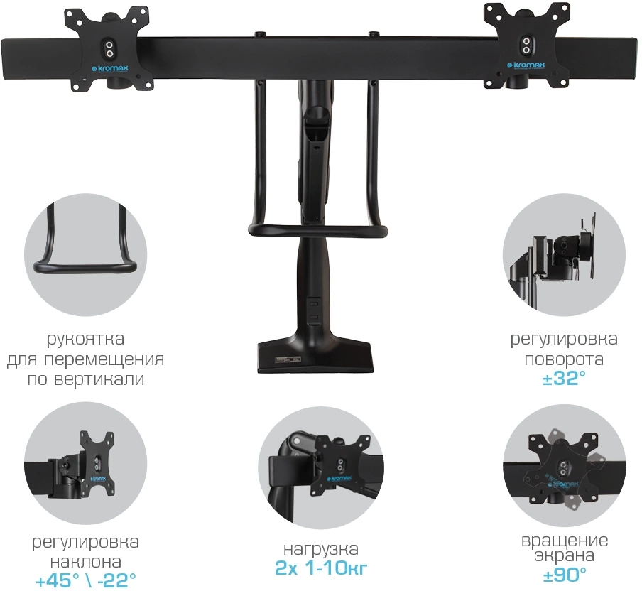 | Особенности | Надежная стальная конструкция, Многофункциональный – мониторы на кронштейне можно поворачивать вокруг совей оси на 360°, наклонять вверх и вниз, придвигать или удалять от себя, Регулируемое положение по высоте, максимальная высота 688 мм, Кабель-каналы для укладки соединительных кабелей |