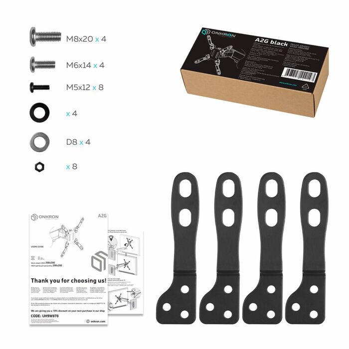 Универсальный адаптер ONKRON A2G предназначен для установки мониторов с размерами монтажных отверстий 100х200, 200х100, 200х200 на любой кронштейн ONKRON с VESA-панелью, обладающей монтажными отверстиями 75х75 и 100х100 мм.