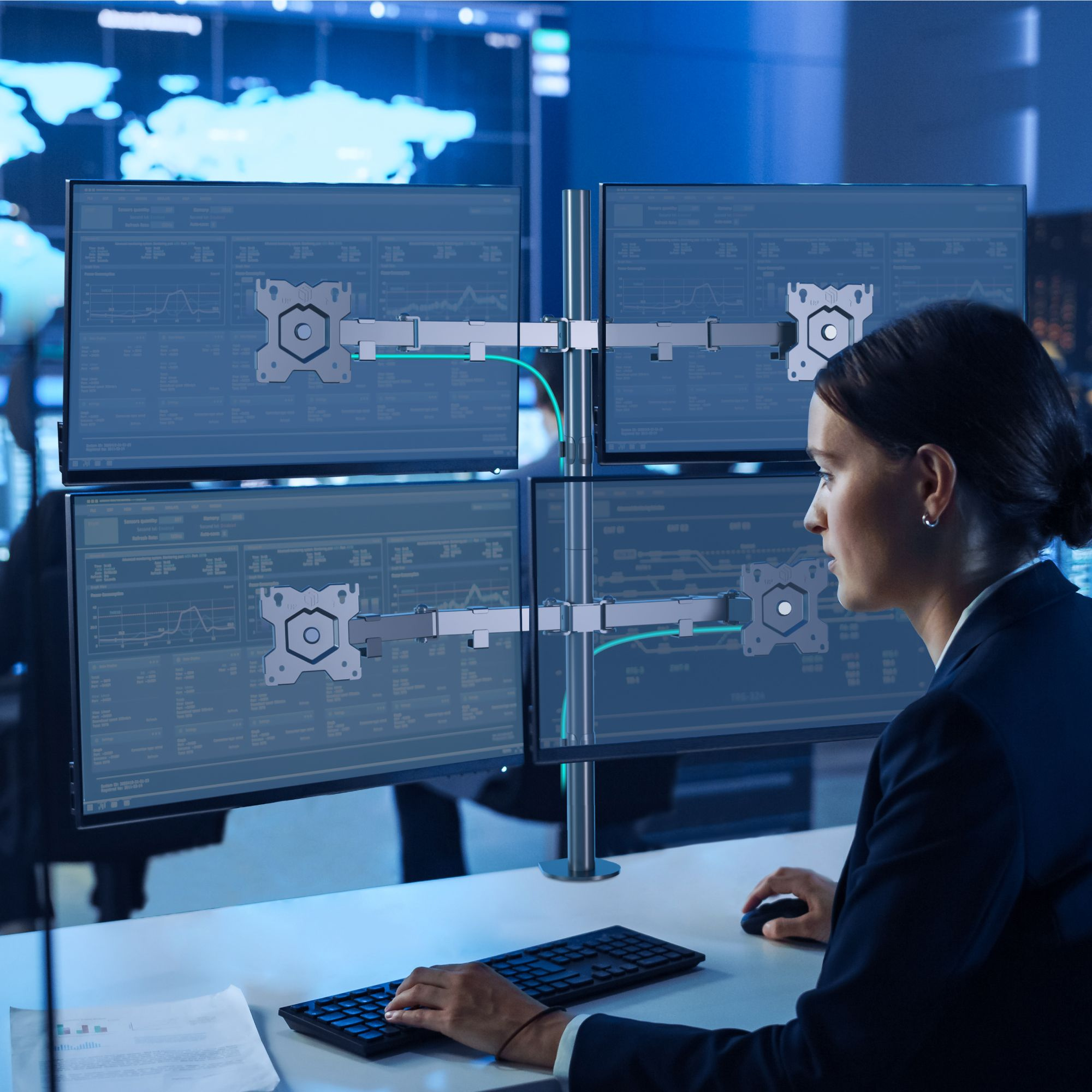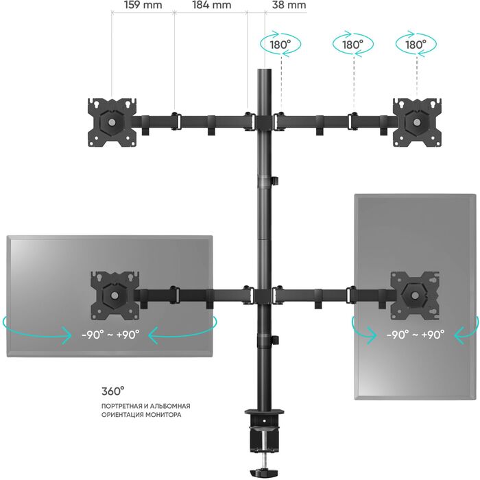 Настольный кронштейн для четырех мониторов, ONKRON D421E подходит для мониторов и телевизоров диагональю от 13 до 32 дюймов и весом до 8 кг на каждый.
