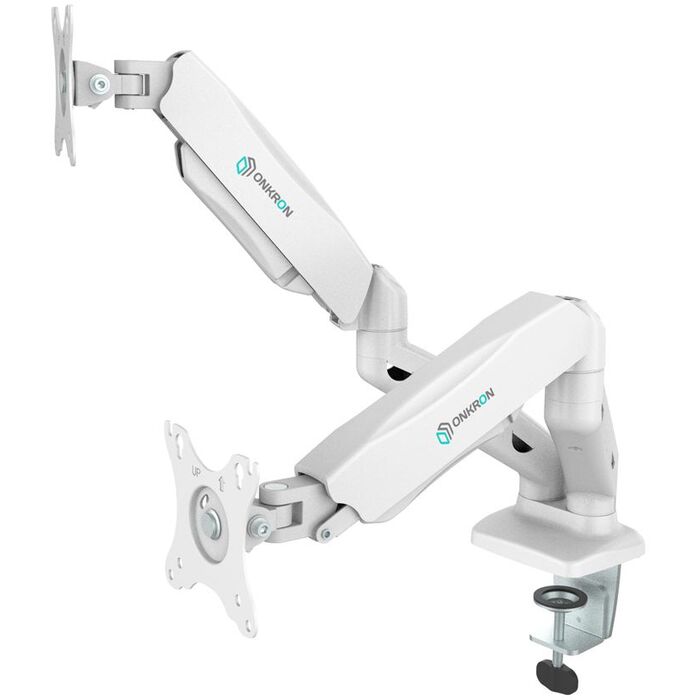 Настольный наклонно-поворотный кронштейн для двух мониторов, выполненный по технологии газлифт, ONKRON G160 подходит для мониторов и телевизоров диагональю от 13 до 27 дюймов и весом до 8 кг на каждый.