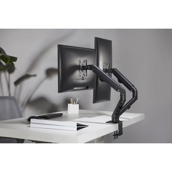 | Особенности | Настольный кронштейн с двумя креплениями под мониторы. Пружинный механизм позволяет легко перемещаться вверх и вниз. |