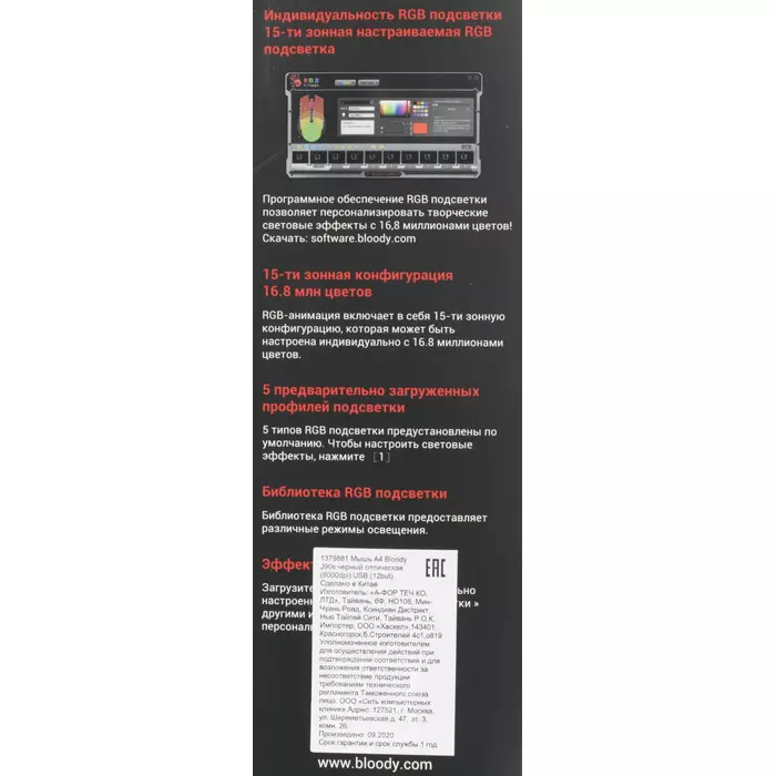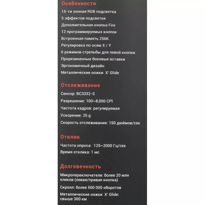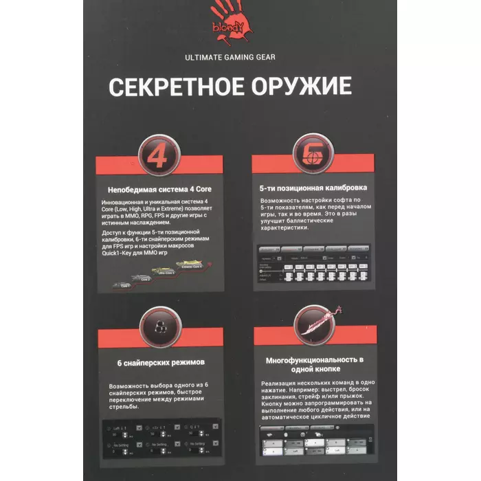 | Особенности | При установке ПО Bloody7, уровни core3,4 активированы бесплатно.15-ти зонная RGB подсветка5 эффектов подсветкиДополнительная кнопка FireВстроенная память 256K6 режимов стрельбы для левой кнопкиМеталлические ножки X' Glide |