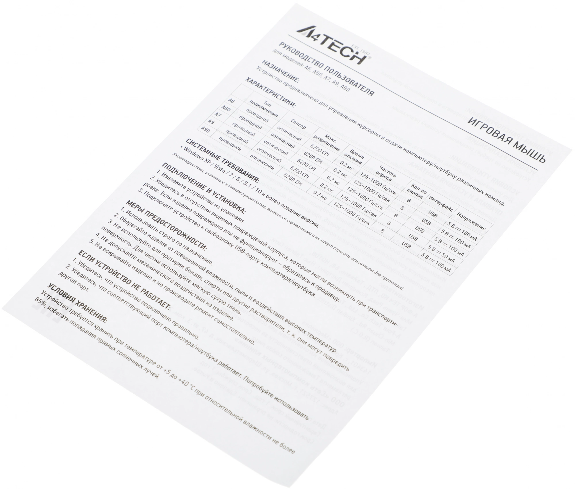 | Частота опроса USB порта | 125-1000 Гц |