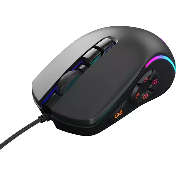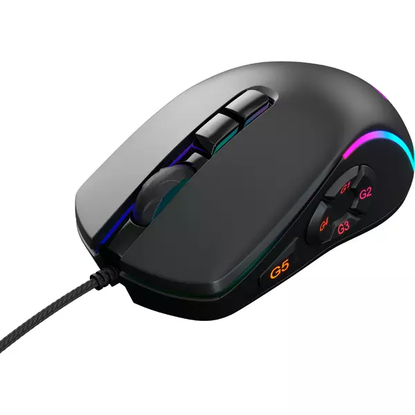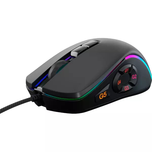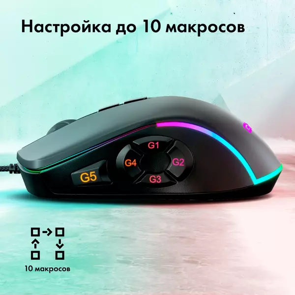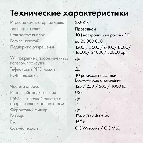 ОсобенностиИгровая компьютерная мышь с разрешением до 32000 dpi. Прорезиненное колесо, софт-тач покрытие корпуса, RGB подсветка, тефлоновые ножки, плетеный кабель с магнитным фильтром, позолоченный коннектор