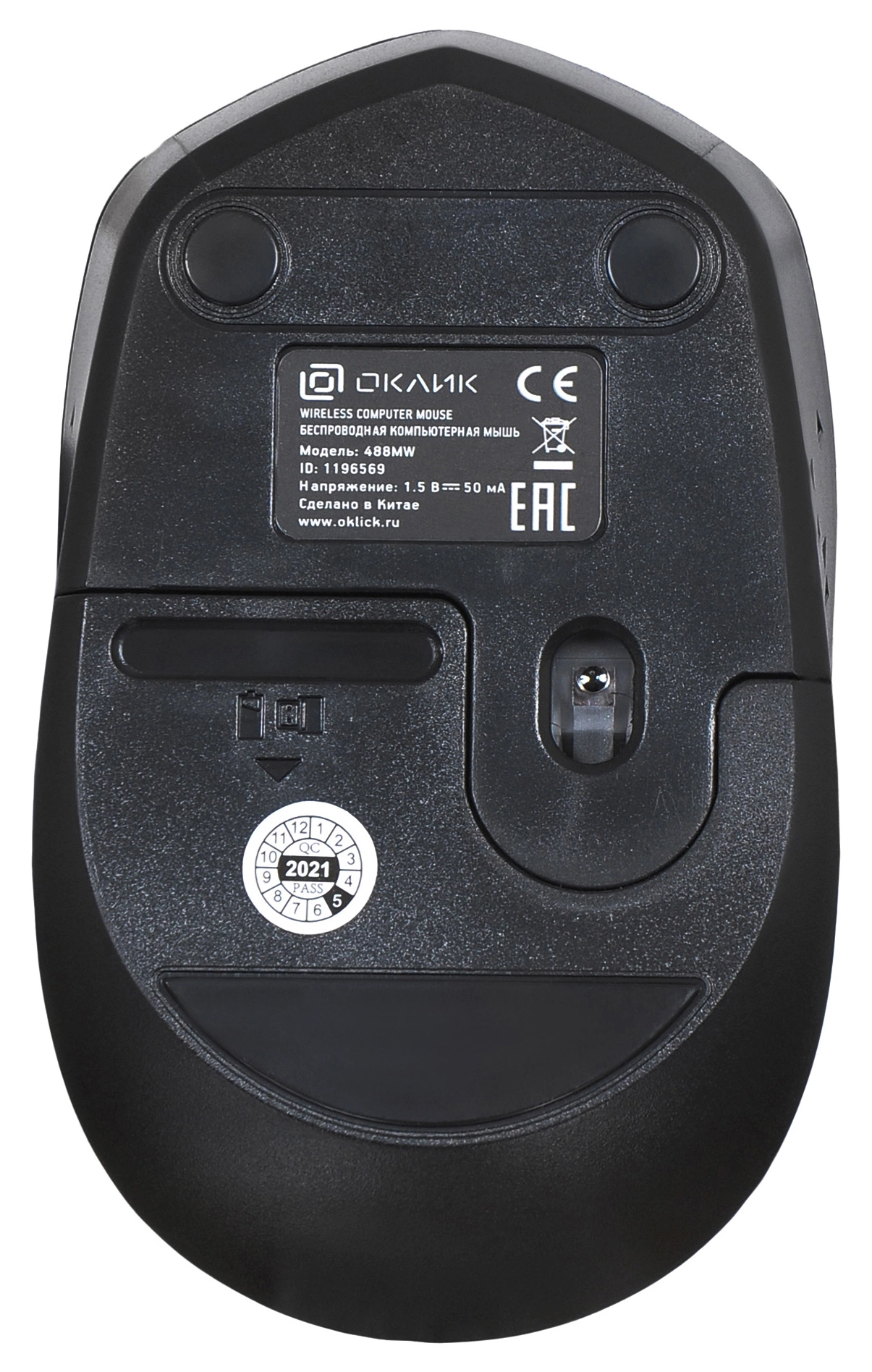 Oklick 488MW подключается к ПК по радиоканалу 2,4 ГГц. В комплект входит USB-ресивер, убирающийся в корпус, а также одна пальчиковая батарейка типа АА.