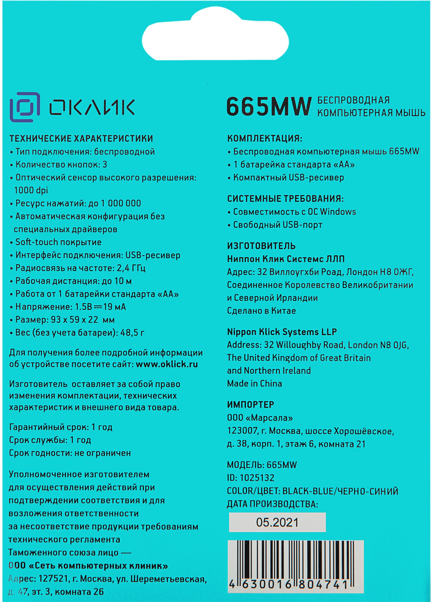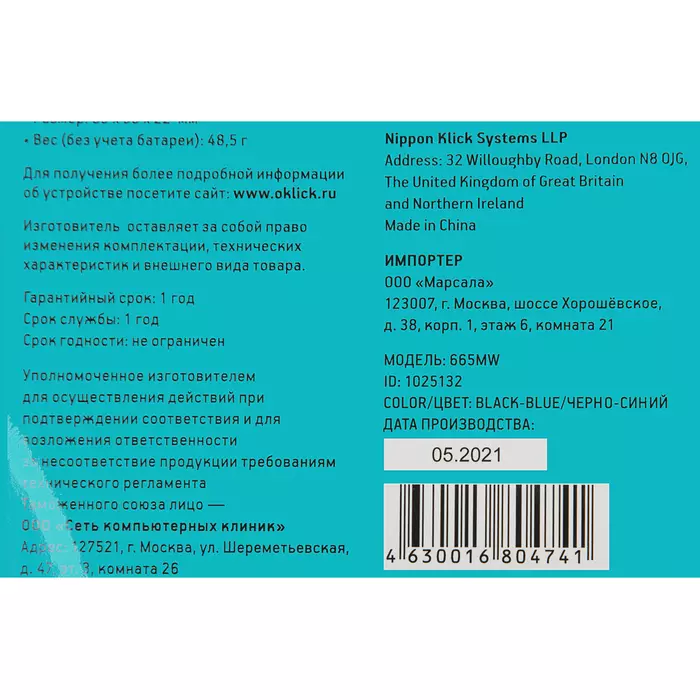 | Комплект поставки | Беспроводная компьютерная мышь 665MW, Батарейка "АА" х 1 шт., USB-ресивер |