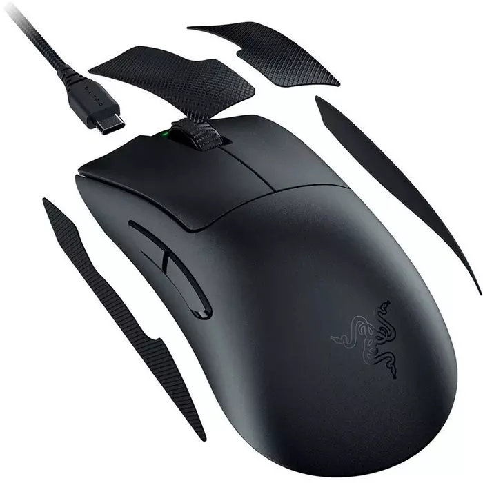 | Особенности | Беспроводная связь Razer Hyperspeed или проводной режим. 5 программируемых кнопок. Сверхлегкая 63 грамма. Оптический сенсор Razer Focus Pro 30 000 DPI. |