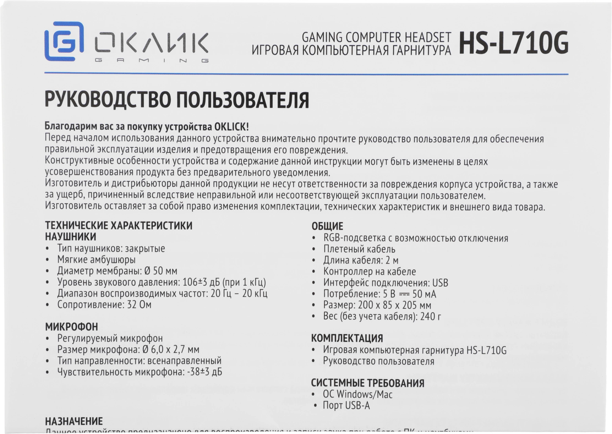 Описание Oklick HS-L710G [1978693]