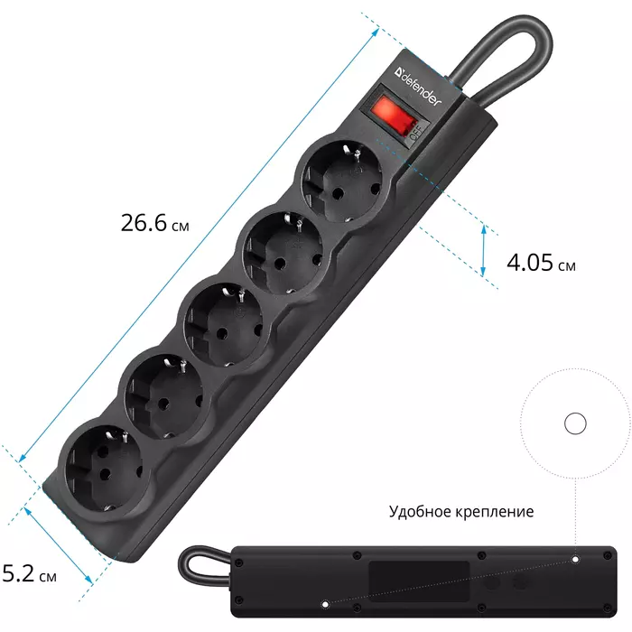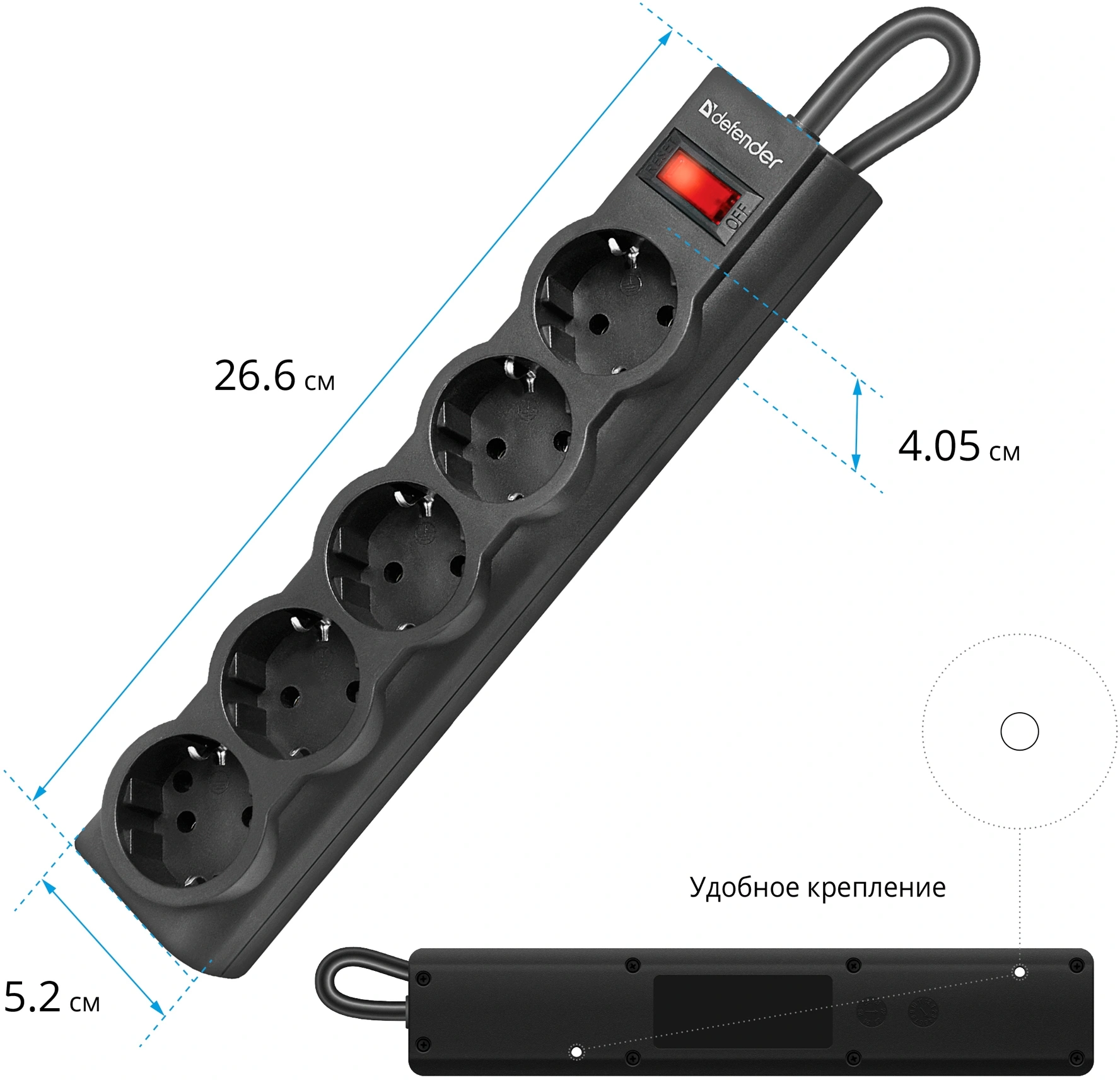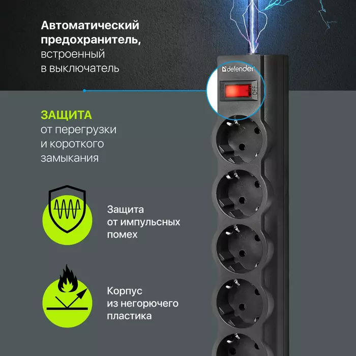 | Особенности | 5 розеток с заземлением. Автоматический предохранитель, встроенный в выключатель. Защита от перегрузки и короткого замыкания. Защита от импульсных помех. Индикатор сети. Крепление на стену. Корпус из негорючего пластика. |