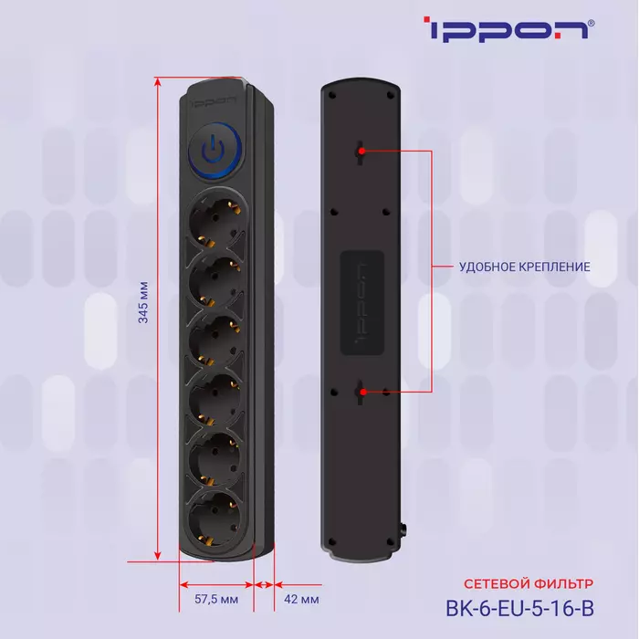 | Особенности | 6 евророзеток с заземлением. Входная вилка Schuko. Защита от перегрузки. Защита от импульсов высокого напряжения. Защита от перетирания провода в месте входа в корпус фильтра. Ударопрочный негорючий корпус. Кнопка питания с индикатором сети. |