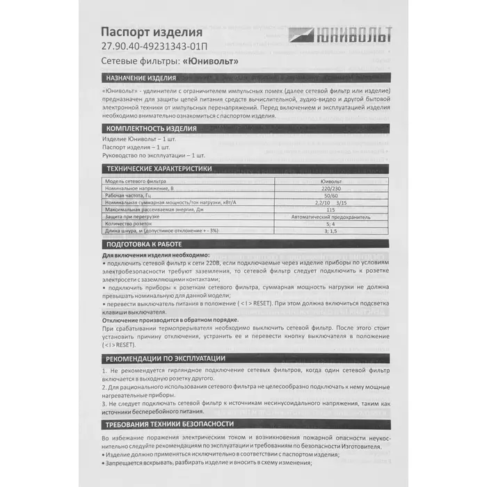 Описание Юнивольт 00-00000406