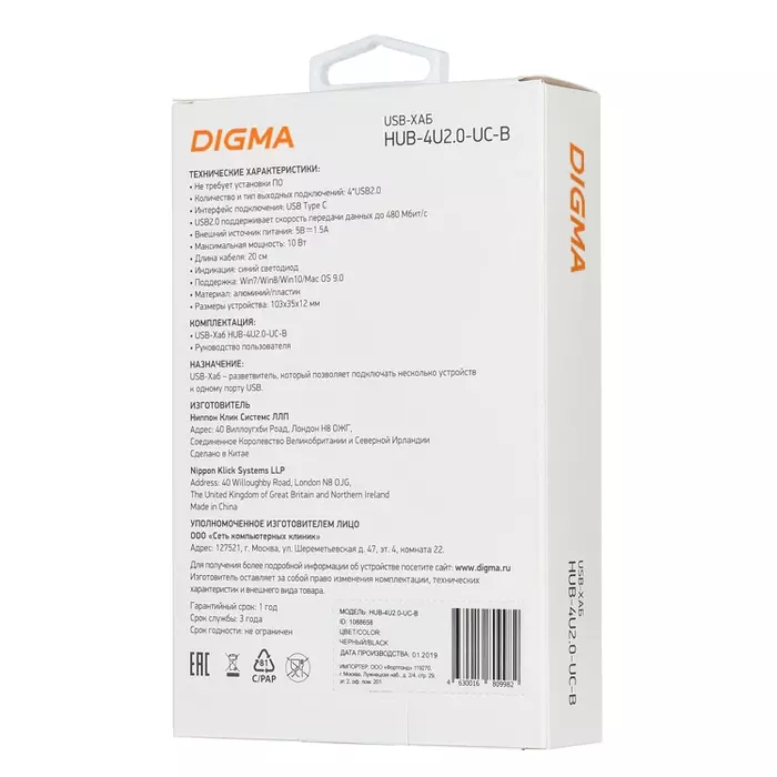 Разветвитель Digma HUB-4U2.0-UC-B 4порт. черный