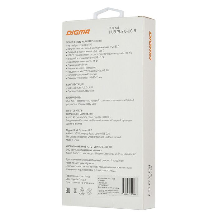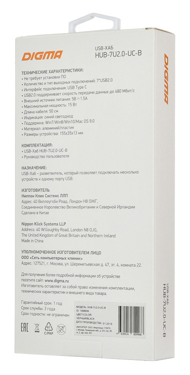 Описание Digma HUB-7U2.0-UC-B